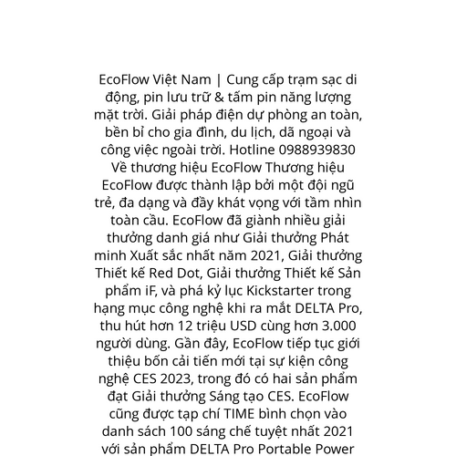 Website: https://ecoflowvietnam.com/. EcoFlow Việt Nam | Cung cấp trạm sạc di động, pin lưu trữ & tấm pin năng lượng mặt trời. Giải pháp điện dự phòng an toàn, bền bỉ cho gia đình, du lịch, dã ngoại và công việc ngoài trời. Hotline 0988939830 Về
