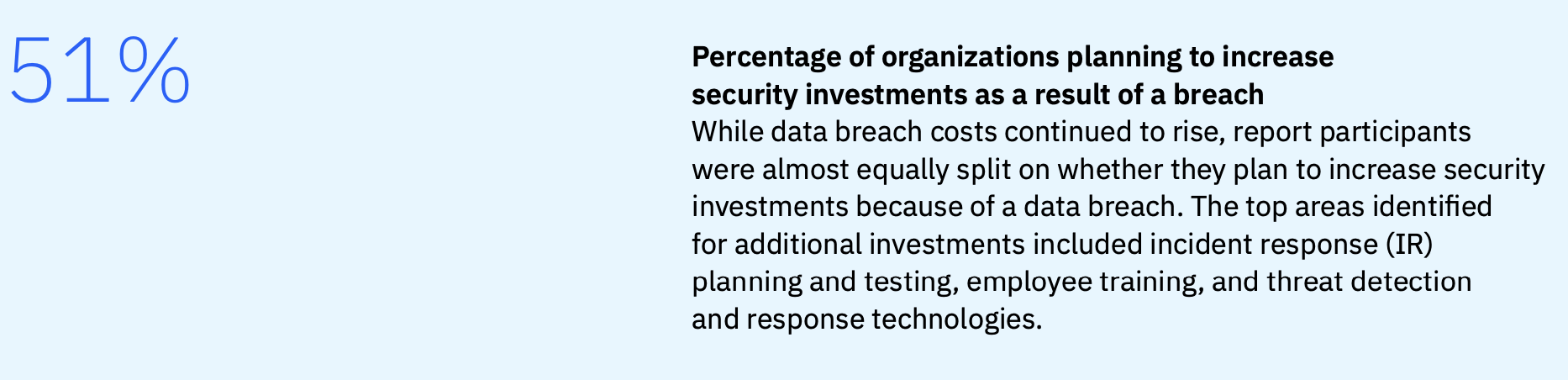 According to IBM’s Cost of a Data Breach Report 2023, half of the companies surveyed plan to expand their budget after a security incident.