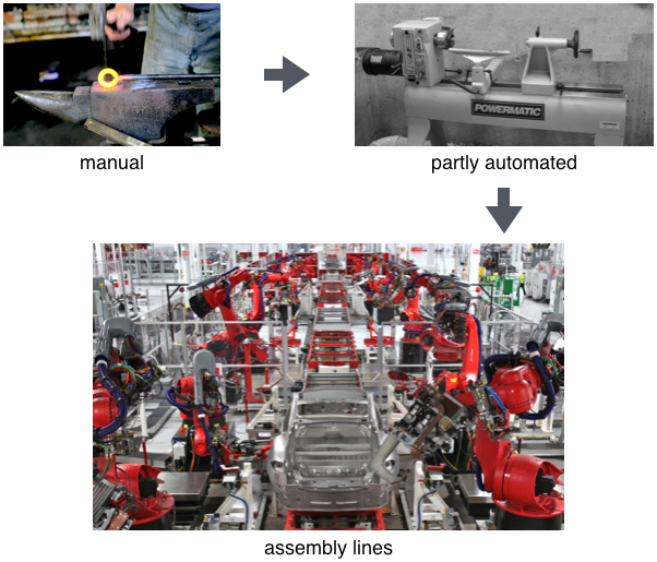 Pode ser entendida como uma forma de produção em série; ocorre quando um estabelecimento industrial com o auxílio de máquinas transformam as matérias-primas e produtos semi-acabados em produtos acabados destinados ao consumo. (Wikipédia)
