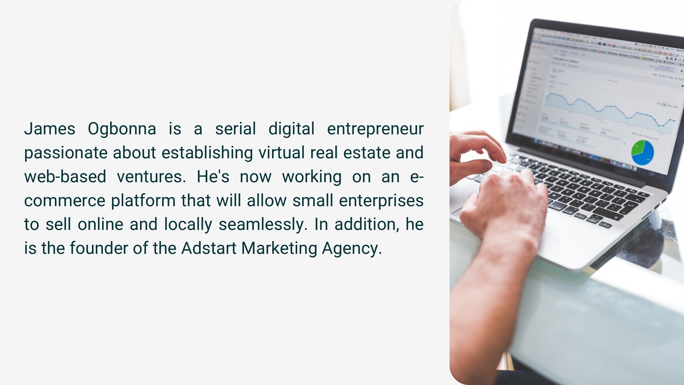 Serial digital entrepreneur Egwu James Ogbonna is passionate about establishing virtual real estate and web-based businesses. Now he's developing an e-commerce platform that will allow small businesses to sell online and locally seamlessly. https://twitter.com/EgwuJamesOgbo