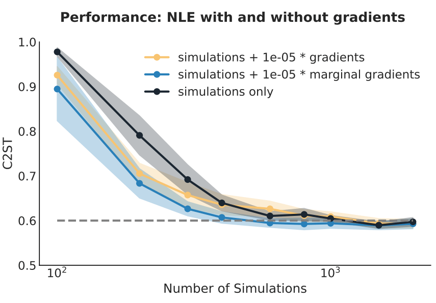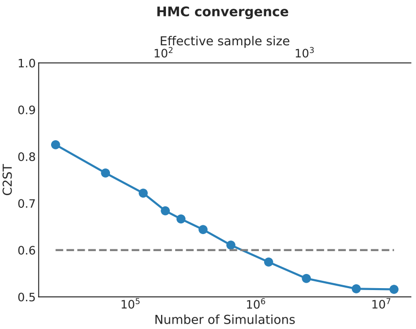 - Implicit inference is vastly more simulation-efficient than naive HMC sampling.
