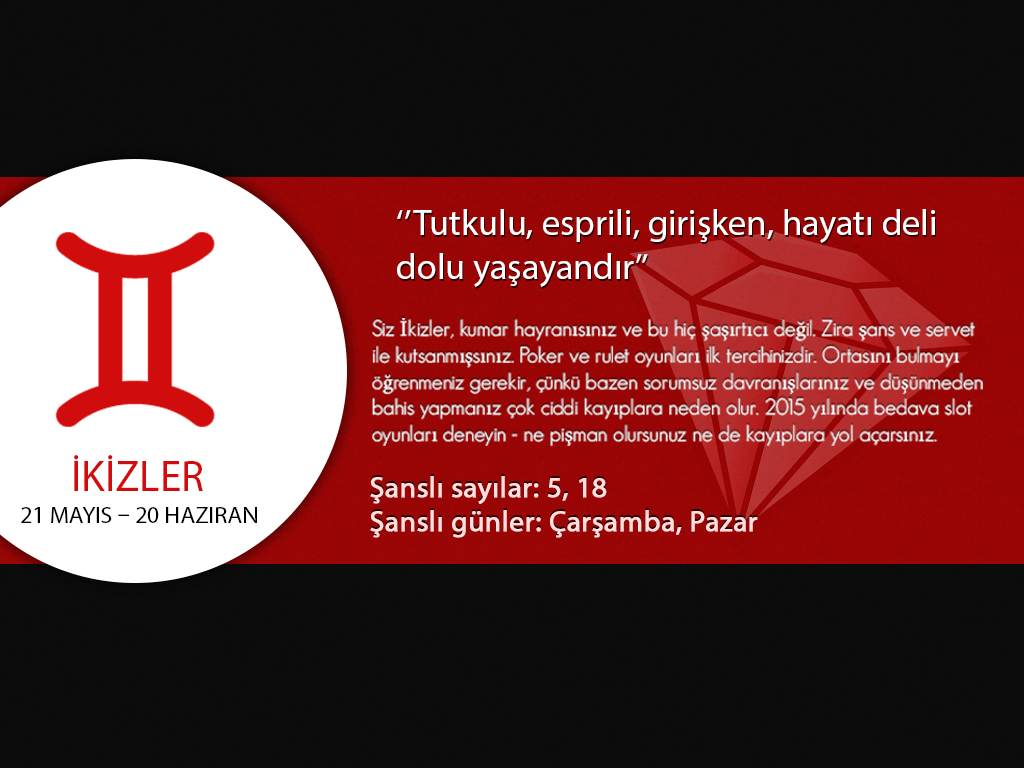 Yıldızlar sizin için neler hazırladığını öğrenmek için Burç Horoskop Haritasını incelemek en kolay yoludur. CasinoBedava'nın Kumar Oynama Yıldız Haritasına bir göz atın, çok şey öğreneceksiniz. Kaynak : http://www.casinobedava.com/blog/sansli-burc-yorumlari-2015-infografik