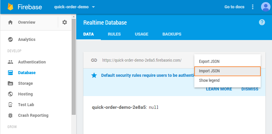 В пункте database вы можете видеть текущие данные вашего firebase приложения. Приложение будет наполняться данными по мере отправки win http запросов из 1с
