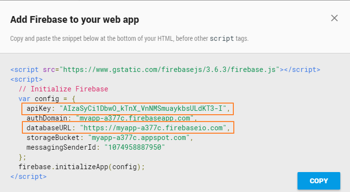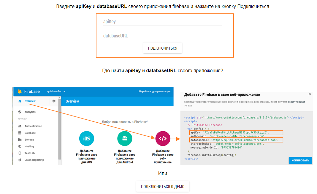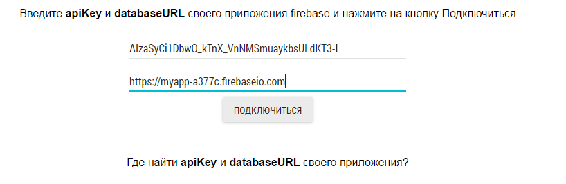 В момент первого запуска веб приложения необходимо ввести apiKey и databaseURL вашего экземпляра firebase