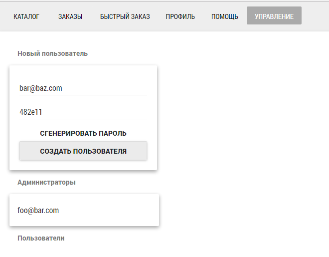 Сразу после создания будет выполнен автоматический вход и через пункт меню Управление администратор имеет возможность добавлять новых пользователей