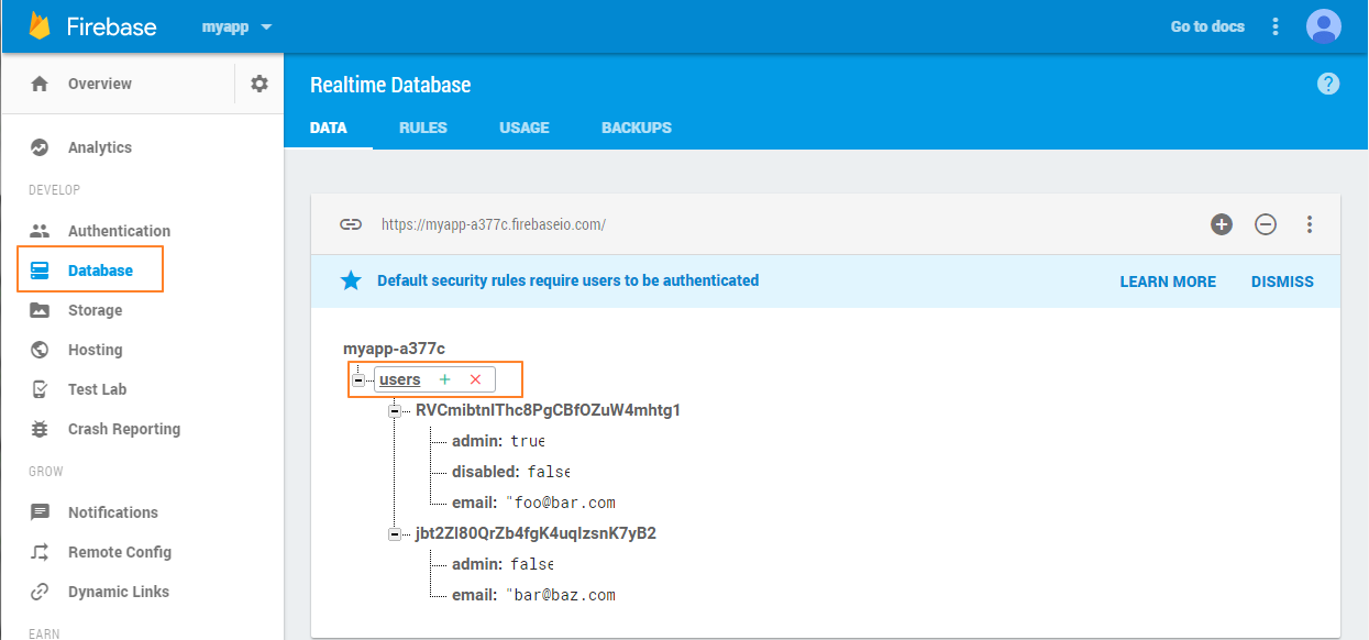 При этом вновь созданных пользователей можно видеть в firebase в соответствующем узле users