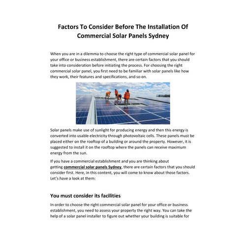 When you are in a dilemma to choose the right type of commercial solar panel for your office or business establishment, there are certain factors that you should take into consideration before initiating the process. Visit - https://electricalexpressnsw.com.au/commercial-solar-panels-sydney/