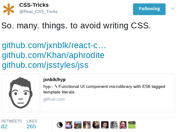 In November 2014, Christopher "vjeux" Chedeau, who is working on React and React Native at Facebook, gave a thought-provoking talk titled "CSS in JS".