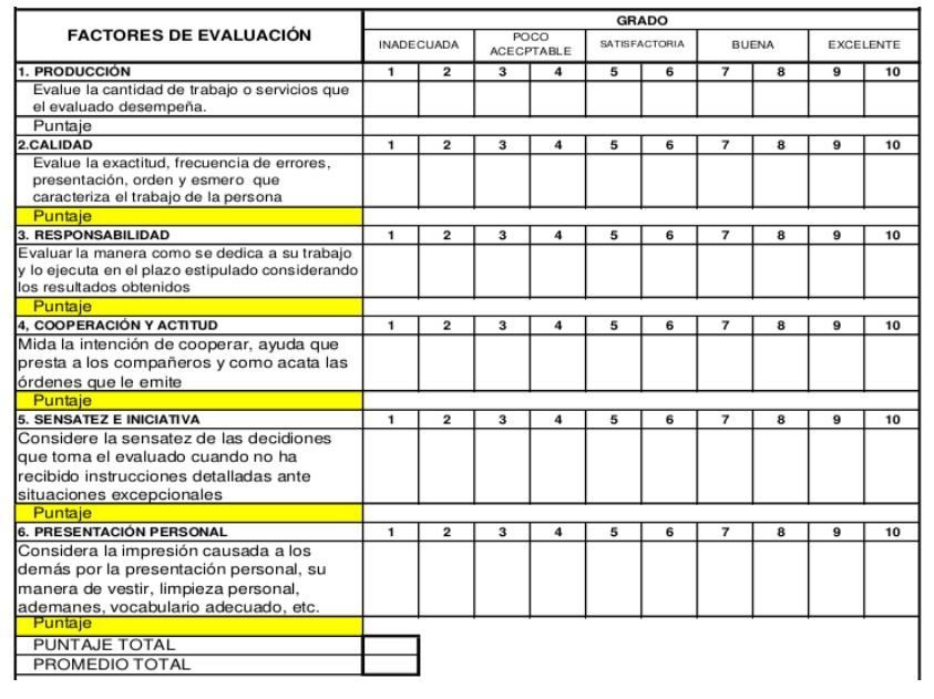 Proceso sistemático por el cual se establecen los parámetros comparativos en función de una escala cuantitativa determinada (ejemplo: puntuación de 1 a 10) o escalas psicológicas cualitativas (bueno, regular, malo, etc.), en el cumplimiento de las responsabilidades y funciones de un determinado puesto de trabajo, evaluación de desempeño ó pos capacitación