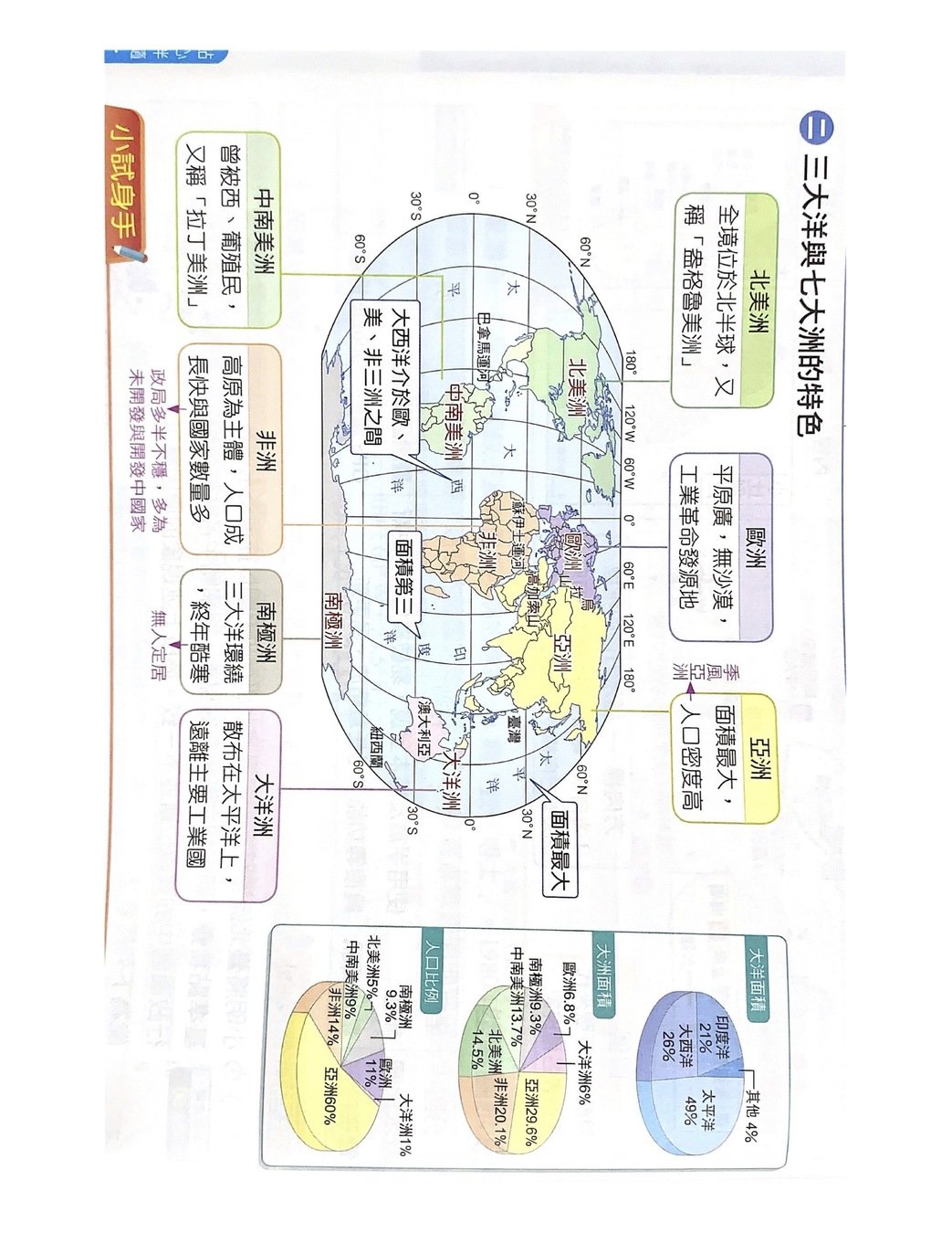 七大洲:亞洲、非洲、北美洲、中南美洲、南極洲、歐洲、大洋洲