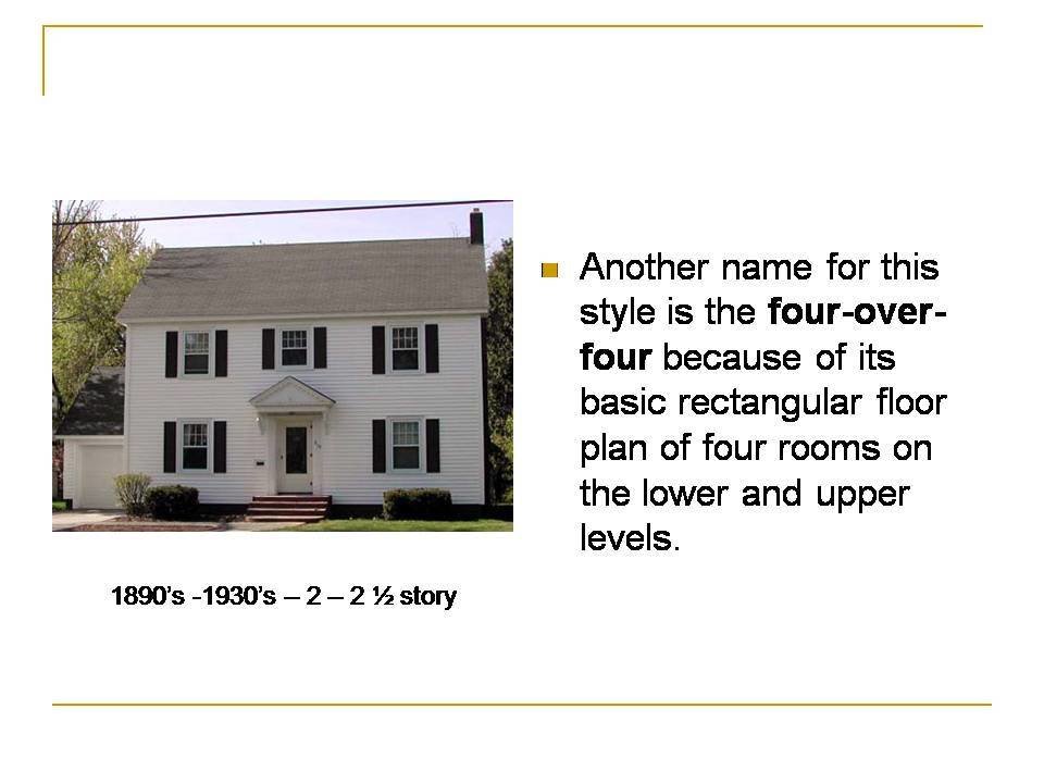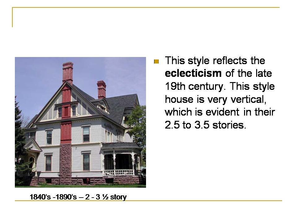 This style reflects the eclecticism of the late 19th century. This style house is very vertical, which is evident in their 2.5 to 3.5 stories.