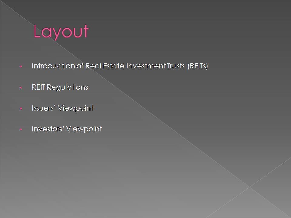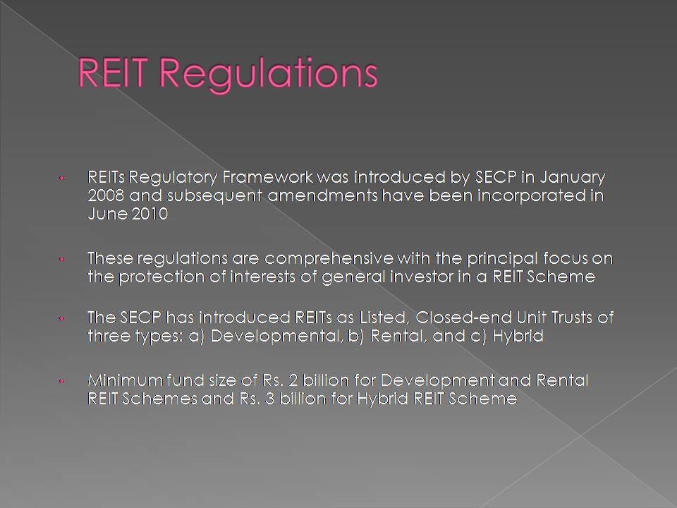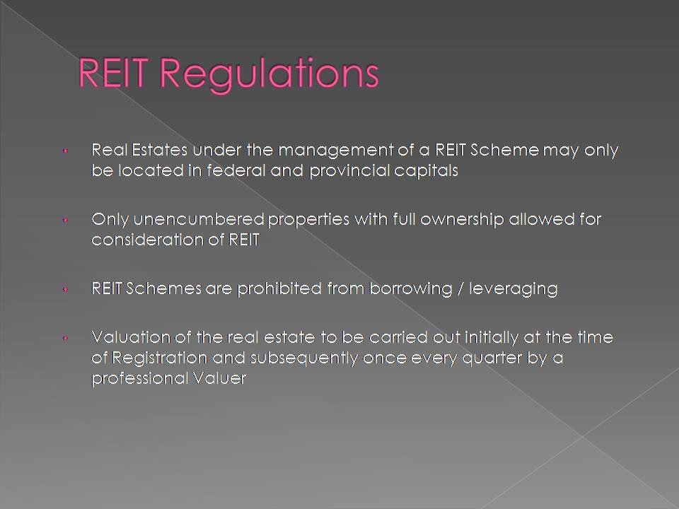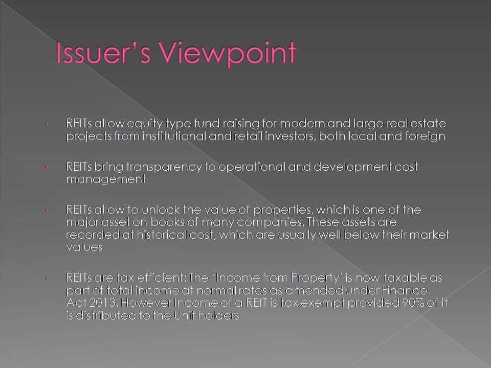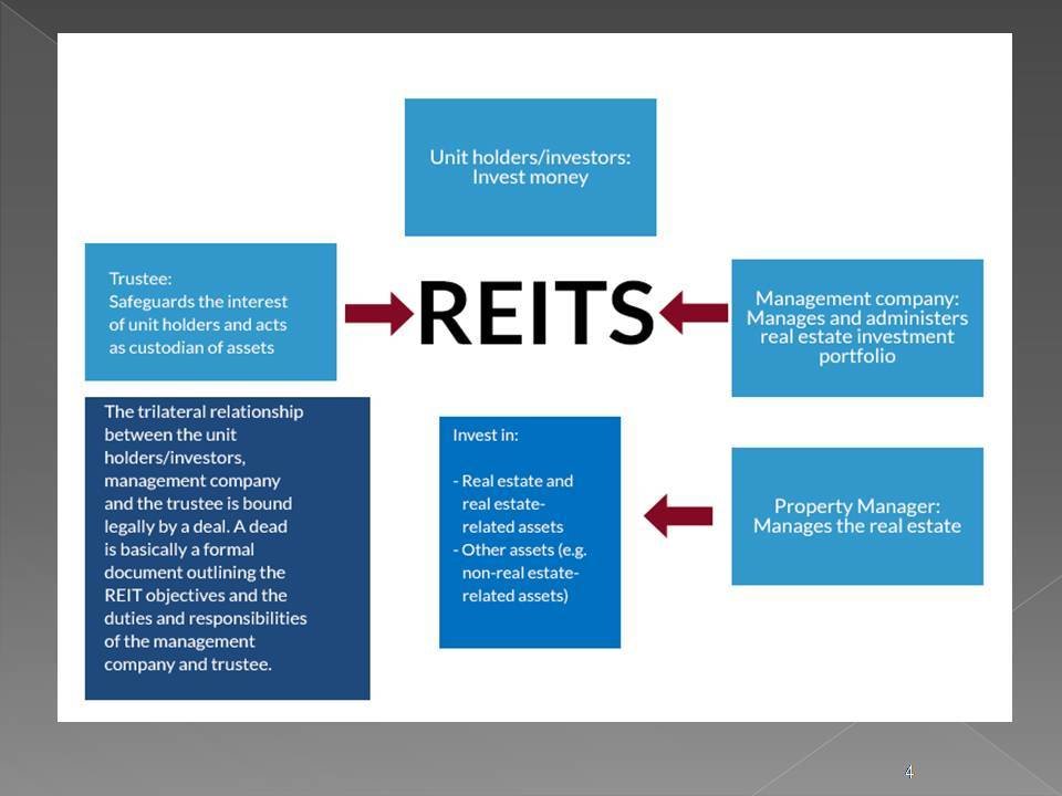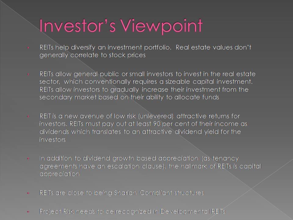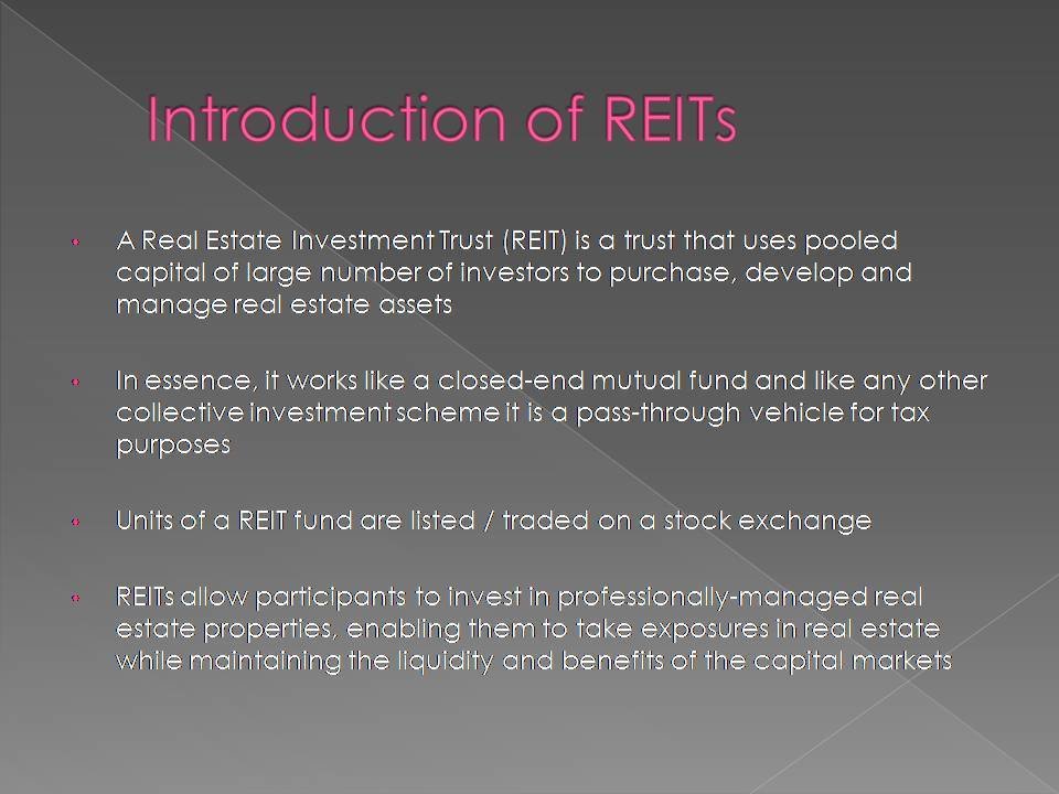 A Real Estate Investment Trust (REIT) is a trust that uses pooled capital of large number of investors to purchase, develop and manage real estate assets.