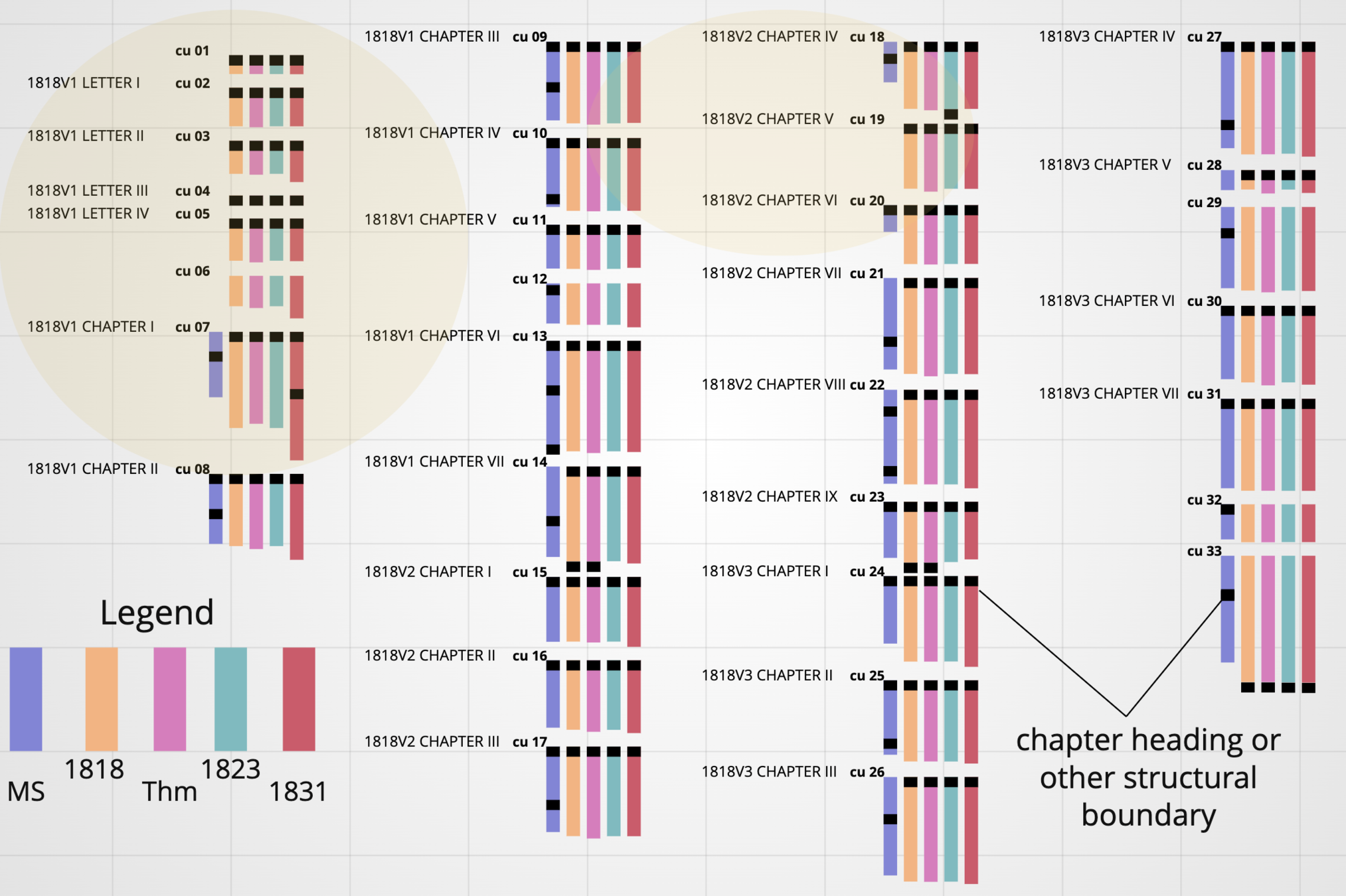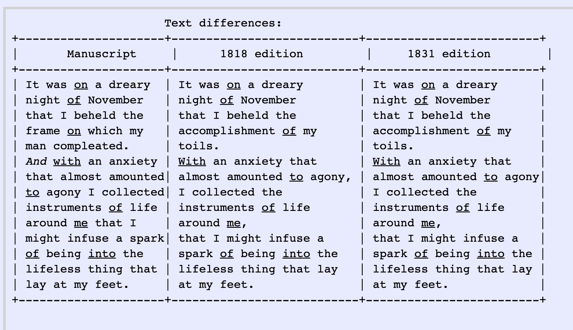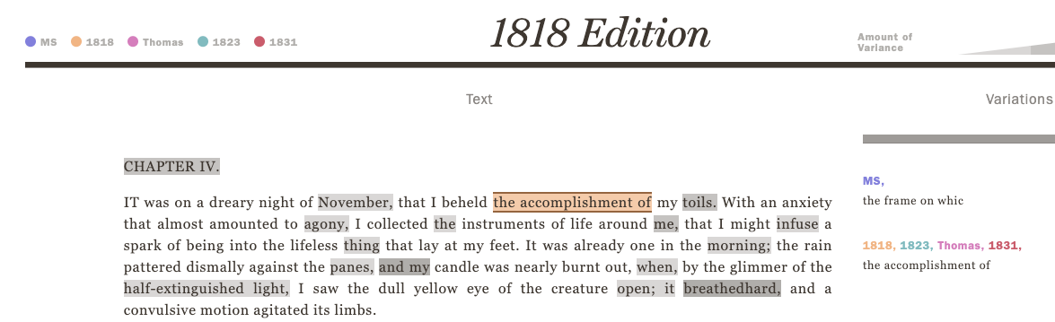 </app>That ugly but orderly and information-rich combination of "flattened" tags and markup is the basis for all the visualized interfaces we build in our digital edition, the Frankenstein Variorum.