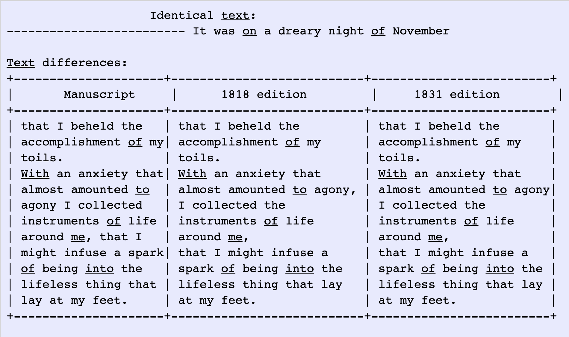 In this refined representation, the identical text block "It was on a dreary night of November" is displayed once at the top, indicating that this portion is the same in all versions. The table below then shows the differing text portions side by side, highlighting the variations between the Manuscript, 1818 edition, and 1831 edition.