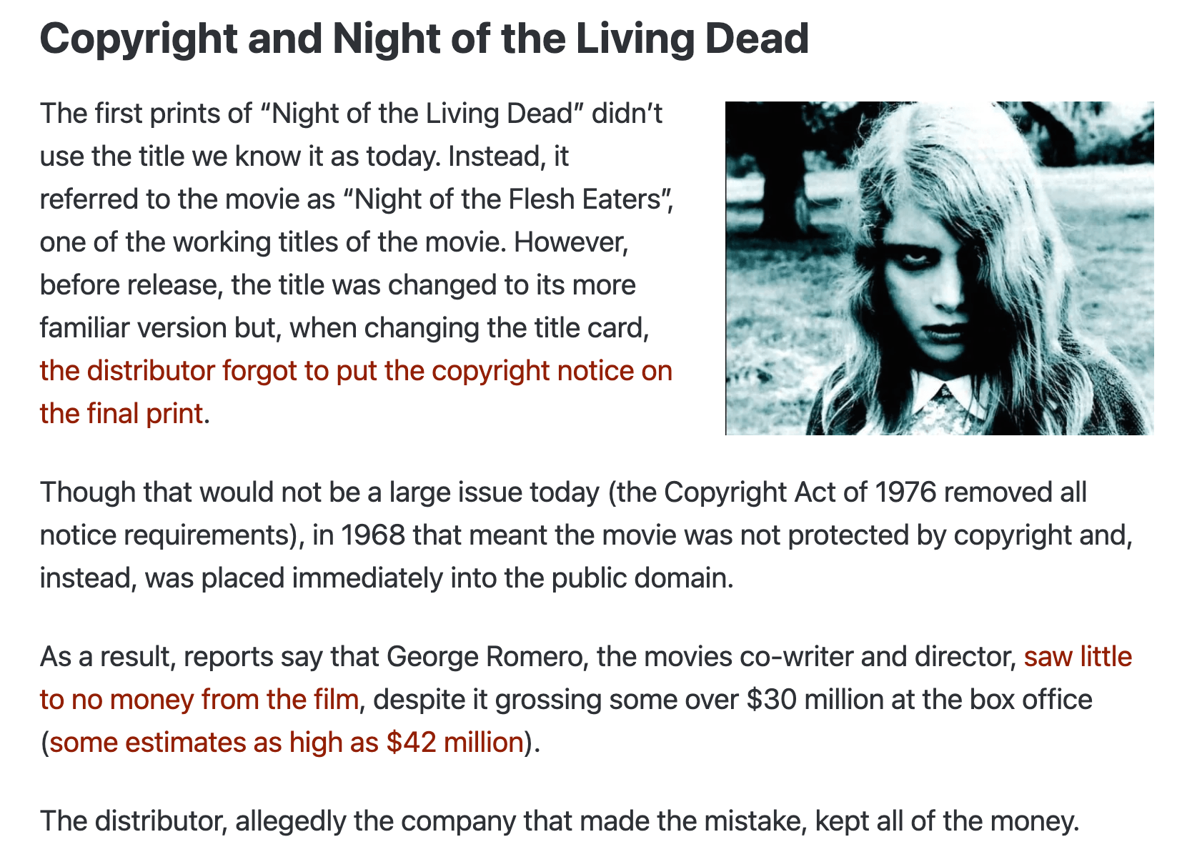 Screenshot from "Copyright and the Night of the Living Dead" section of "How a Copyright Mistake Created the Modern Zombie", Plagiarism Today 10 October 2011.