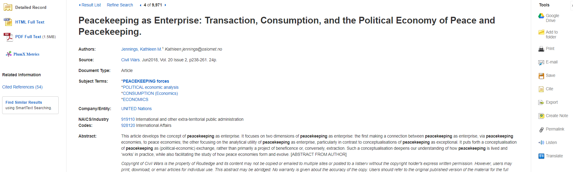 Most databases have citation help tools in their platforms. Look for tools such as Cite or Source Citation. Note: They are not without errors, sometimes it is not the latest edition of the citation style or the citation style you need. Always check citation style handouts and manuals to make changes.