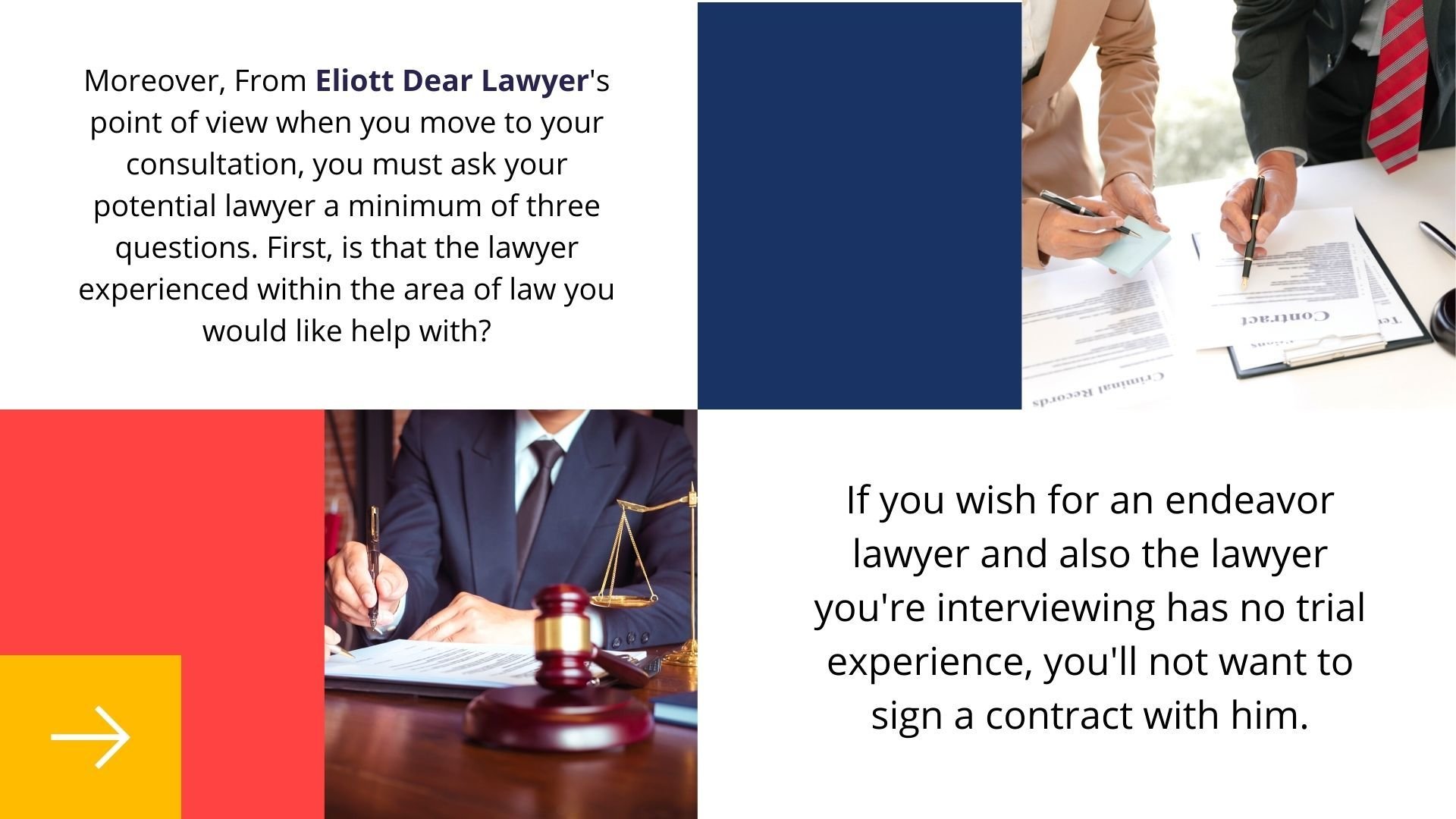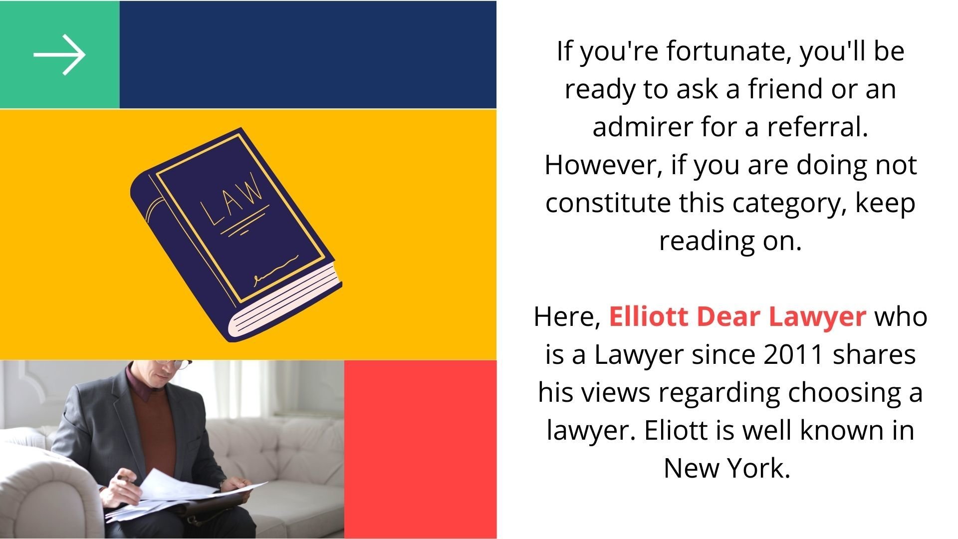 If you need a lawyer, does one know where to start? If you're like the general public, you will not have a clue. Therefore, this text goes to supply an inventory of three inquiries to facilitate your find the correct lawyer for your situation. If you're fortunate, you'll be ready to ask a friend or an admirer for a referral. However, if you are doing not constitute this category, keep reading on. Here, Elliott Dear Lawyer who is a Lawyer since 2011 shares his views regarding choosing a lawyer. Eliott is well known in New York.