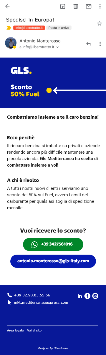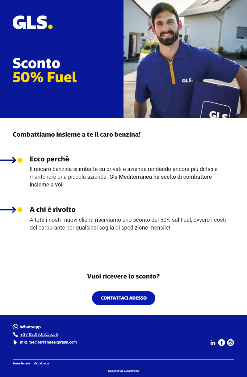 A chi è rivolto: A tutti i nostri nuovi clienti riserviamo uno sconto del 50% sul Fuel, ovvero i costi del carburante per qualsiasi soglia di spedizione mensile!