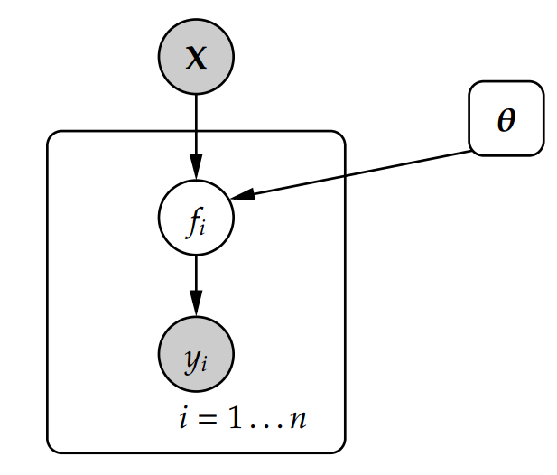 \(p(\textbf{y} \mid \mathbf{f},\textbf{X})\) = likelihood of output variable, given the covariates & function