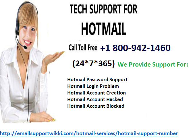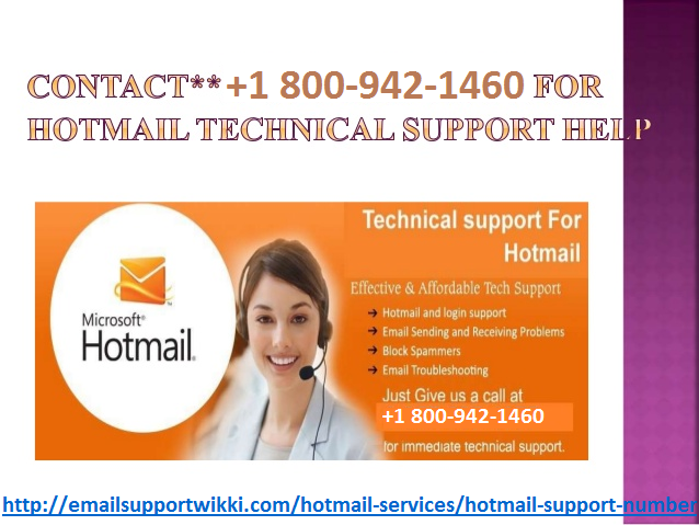 Hotmail is considered to be one of the best and most outstanding platform, which make work very easy and most convenient for users. If your Hotmail account has been locked or hacked. Call Hotmail Support Number 1-800-942-1460 for instant technical help. Call Hotmail support Toll Free Number 1-800-942-1460 to get advanced technical support anytime you are stuck with Hotmail problems in your computer. We promise to provide you technical support for Hotmail anytime you want. Visit http://emailsupportwikki.com/hotmail-services/hotmail-support-number for more detail!