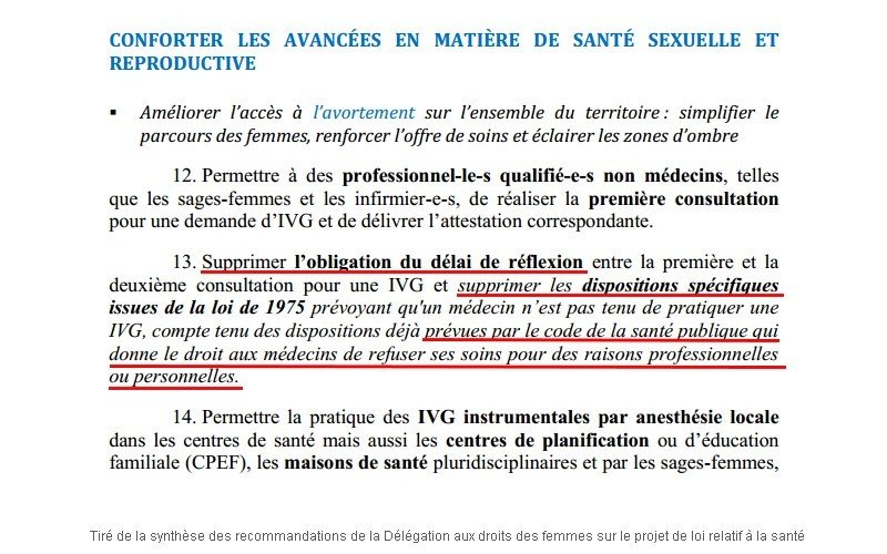 En février 2015, la Délégation aux droits des femmes a publié un rapport d'information dans lequel 21 recommandations ont été développées afin d'enrichir le projet. 5 recommandations se concentrent sur l'accès à l'avortement. L'une d'elles demande d'ailleurs la suppression du délai de réflexion et de la clause de conscience.