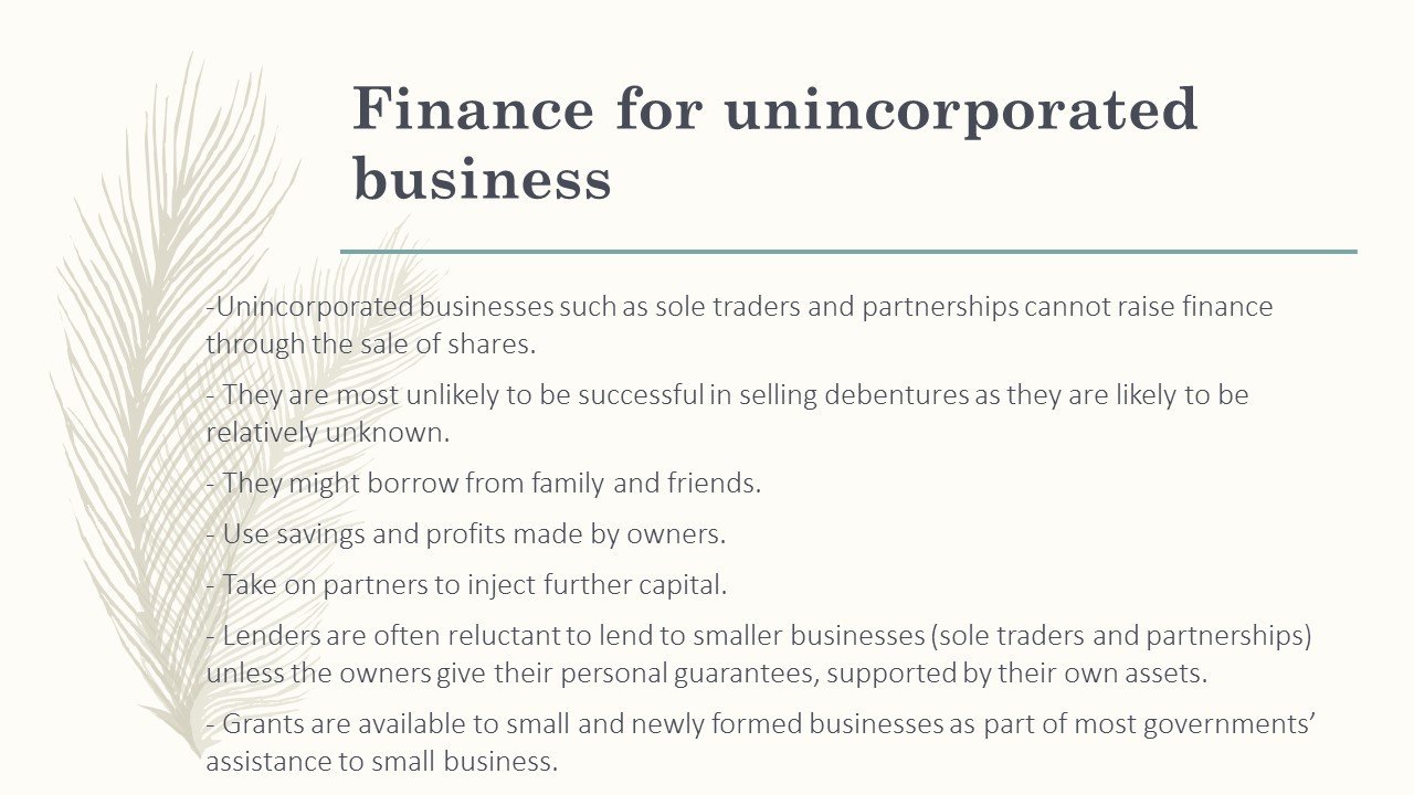 -Unincorporated businesses such as sole traders and partnerships cannot raise finance through the sale of shares. - They are most unlikely to be successful in selling debentures as they are likely to be relatively unknown.
