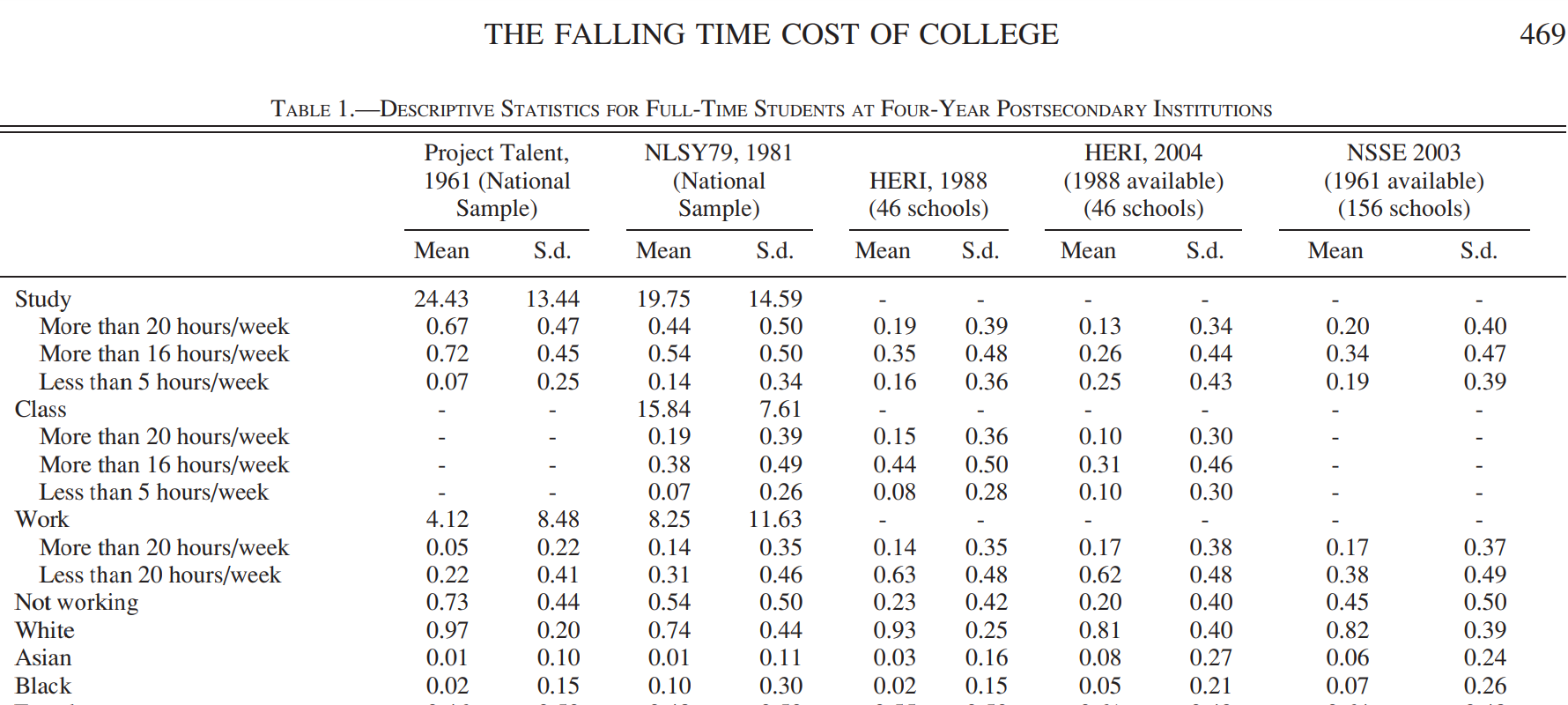 Source: Babcock, P. and Marks, M., 2011. The falling time cost of college: Evidence from half a century of time use data. Review of Economics and Statistics, 93(2), pp.468-478.