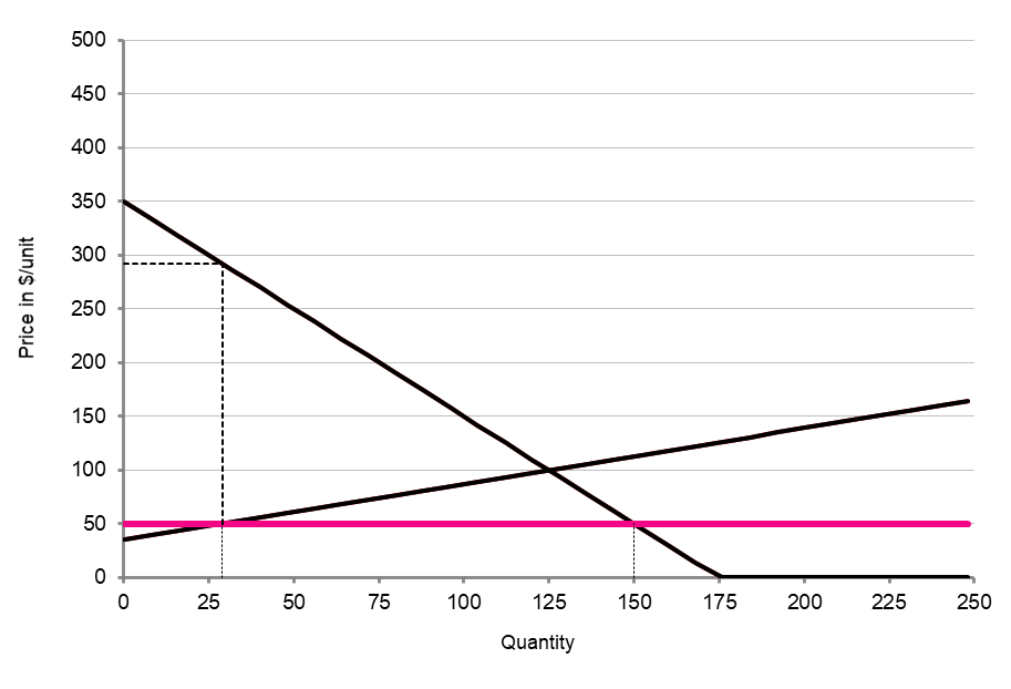 Use the scroll bar to set a tax of $50 dollars per unit on the good
