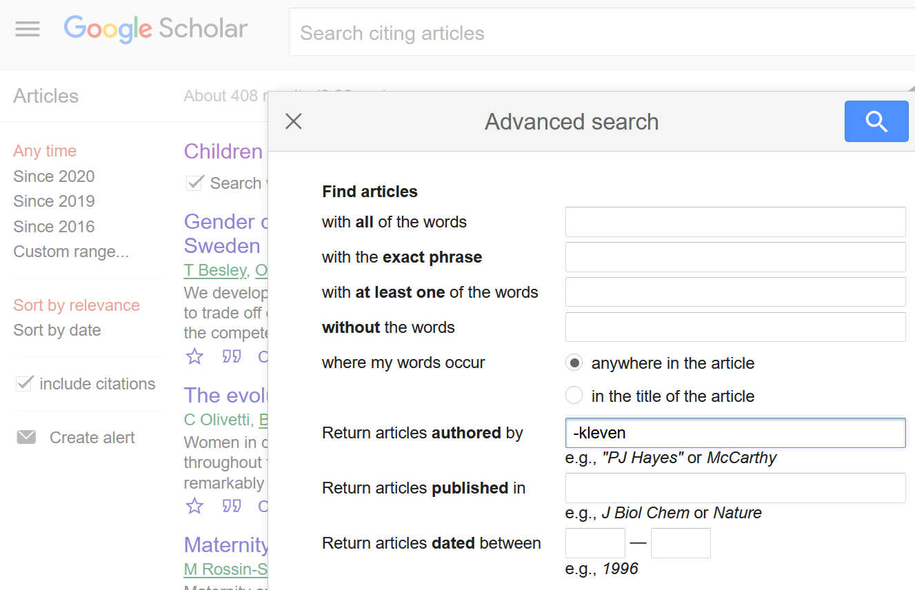 This allows you to specify that the keyword you are searching for should appear in the author name, or in a specific date range