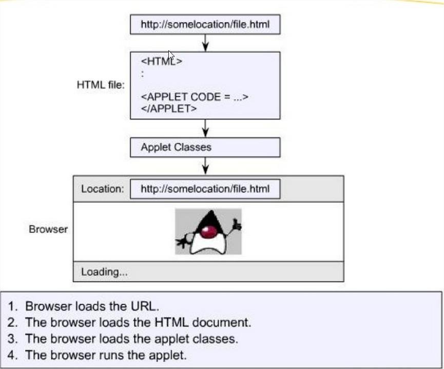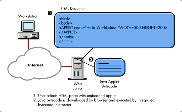 - El navegador interpreta la pagina HTML donde se encuentra insertado el applet. Cuando se encuentra la etiqueta <APPLET> el navegador descarga del mismo servidor donde se encontraba la pagina HTML el bytecode de la clase indicada en la etiqueta <APPLET>