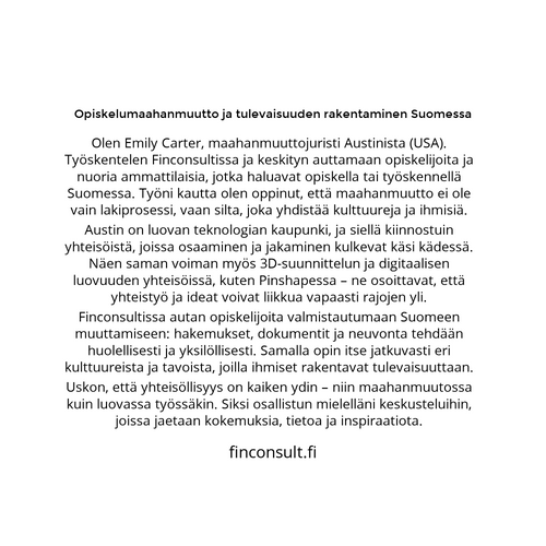 Olen Emily Carter, maahanmuuttojuristi Austinista (USA) finconsult.fi. Olen kiinnostunut opiskelumaahanmuutosta ja siitä, miten koulutus voi avata uusia mahdollisuuksia eri kulttuureissa.