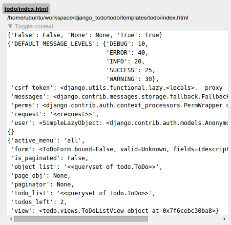 pip install django-debug-toolbarIn Django views, a context is a dictionary of values that the view passes to the template.