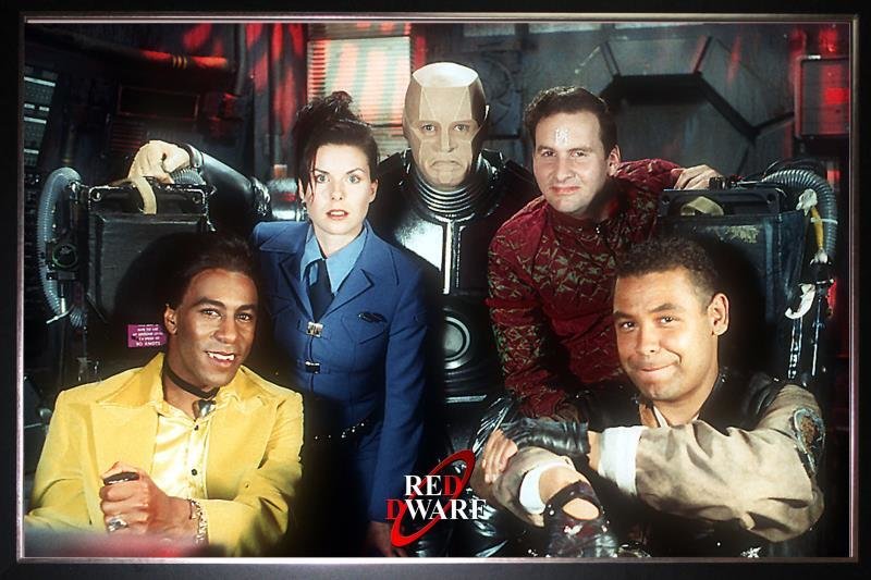 Ett hologram, en katt, en robot och två människor i besättningen på Red Dwarf.