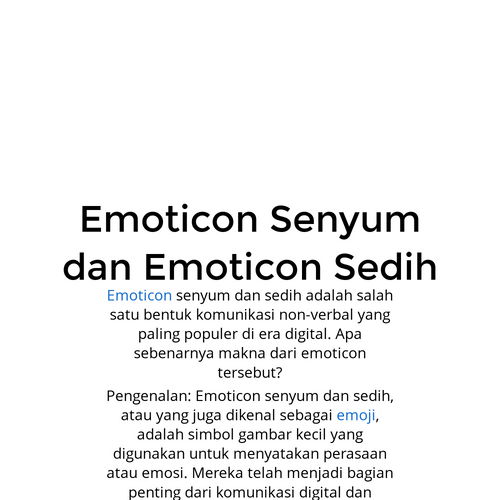 Siapa yang tidak suka tersenyum? Senyum adalah ekspresi wajah yang paling positif dan menyenangkan yang dapat diberikan seseorang. Dan tahukah Anda bahwa emoticon senyum telah menjadi salah satu cara yang paling populer untuk mengekspresikan senyum dalam teks dan pesan sosial? Dalam artikel ini, kita akan membahas emoticon senyum dan bagaimana mereka dapat menambahkan keceriaan dalam komunikasi digital Anda. Introduction: Emoticon senyum atau emoticon dengan ekspresi wajah tersenyum adalah salah satu jenis emoticon yang paling sering digunakan dalam komunikasi digital. Emoticon ini berbentuk lingkaran kuning dengan dua mata hitam, dan mulut yang melengkung ke atas, menunjukkan senyum yang ramah dan hangat. Emoticon senyum sangat populer karena mudah digunakan dan dapat mengekspresikan berbagai perasaan positif seperti kebahagiaan, sukacita, kegembiraan, dan kepuasan. H1: Sejarah Emoticon Senyum Emoticon senyum pertama kali diciptakan pada tahun 1963 oleh ilustrator Amerika Harvey Ball. Harvey Ball menciptakan emoticon senyum untuk kampanye kecil yang disponsori oleh perusahaan asuransi di Worcester, Massachusetts. Emoticon senyum asli hanya memiliki mata dan mulut, tanpa lingkaran kuning. Namun, sejak itu emoticon senyum telah mengalami banyak perubahan dan sekarang menjadi salah satu jenis emoticon yang paling terkenal dan sering digunakan. H2: Cara Menggunakan Emoticon Senyum Emoticon senyum sangat mudah digunakan dan dapat ditambahkan ke hampir semua jenis pesan atau teks. Untuk menambahkan emoticon senyum, cukup ketikkan ":" dan ")", atau tekan tombol emoticon di ponsel atau perangkat digital Anda dan pilih emoticon senyum dari daftar emoticon yang tersedia. Emoticon senyum dapat digunakan dalam berbagai situasi dan dapat menunjukkan berbagai perasaan positif seperti kebahagiaan, sukacita, kegembiraan, dan kepuasan. Emoticon senyum juga dapat digunakan untuk menunjukkan kehangatan dan keramahan dalam percakapan digital. H3: Jenis-Jenis Emoticon Senyum Meskipun emoticon senyum asli hanya memiliki mata dan mulut, sekarang terdapat banyak jenis emoticon senyum yang berbeda yang dapat digunakan dalam pesan dan teks. Beberapa jenis emoticon senyum yang paling populer antara lain: Emoticon Senyum Biasa: Emoticon senyum biasa memiliki lingkaran kuning dengan dua mata hitam dan mulut yang melengkung ke atas. Emoticon Senyum dengan Mata Tertutup: Emoticon senyum dengan mata tertutup menunjukkan perasaan yang sangat senang atau puas. Emoticon Senyum dengan Bibir Tertutup: Emoticon senyum dengan bibir tertutup menunjukkan senyum yang sopan dan ramah. Emoticon Senyum dengan Tangan Tertutup: Emoticon senyum dengan tangan tertutup menunjukkan perasaan senang atau puas yang besar. seperti dikutip justecno.com Emoticon Senyum Tapi Sedih