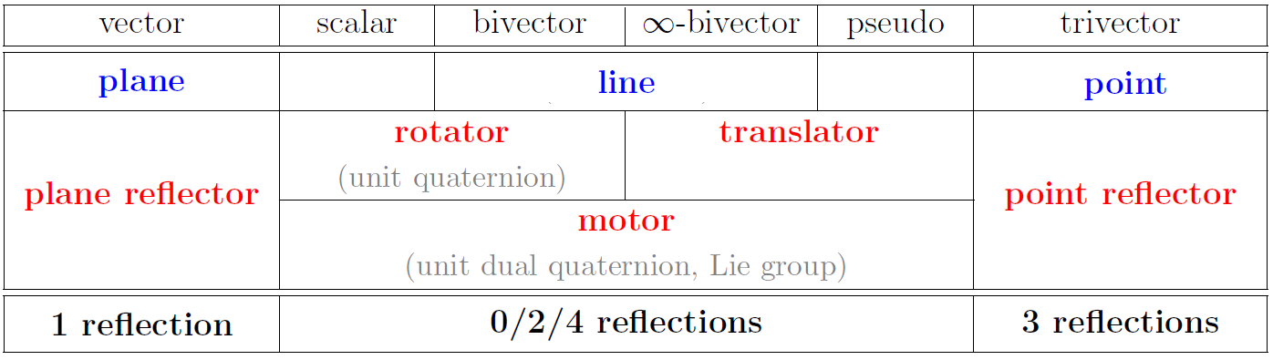 That explains the notation \(\mathbb{R}^{d,0,1}\) for PGA: there are \(d\) Euclidean dimensions, plus an extra null dimension.