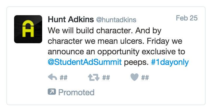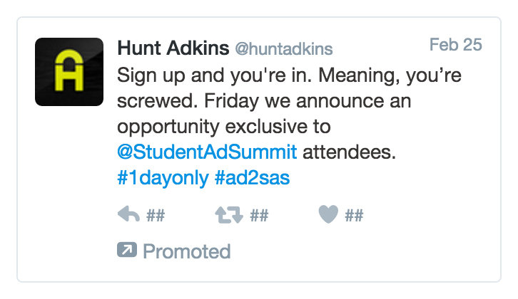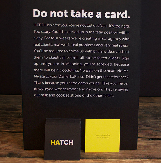 To ensure Hunt Adkins got the hungriest and brightest individuals for this baptism by fire educational experience, they developed a campaign that removed any and all sugarcoating. They teased and intrigued with unconventional messaging and industry truths to rally like-minded creative strategists. Creative was seeded at scholastic events and on social media to generate an exclusive, insider tone to the entire experience.