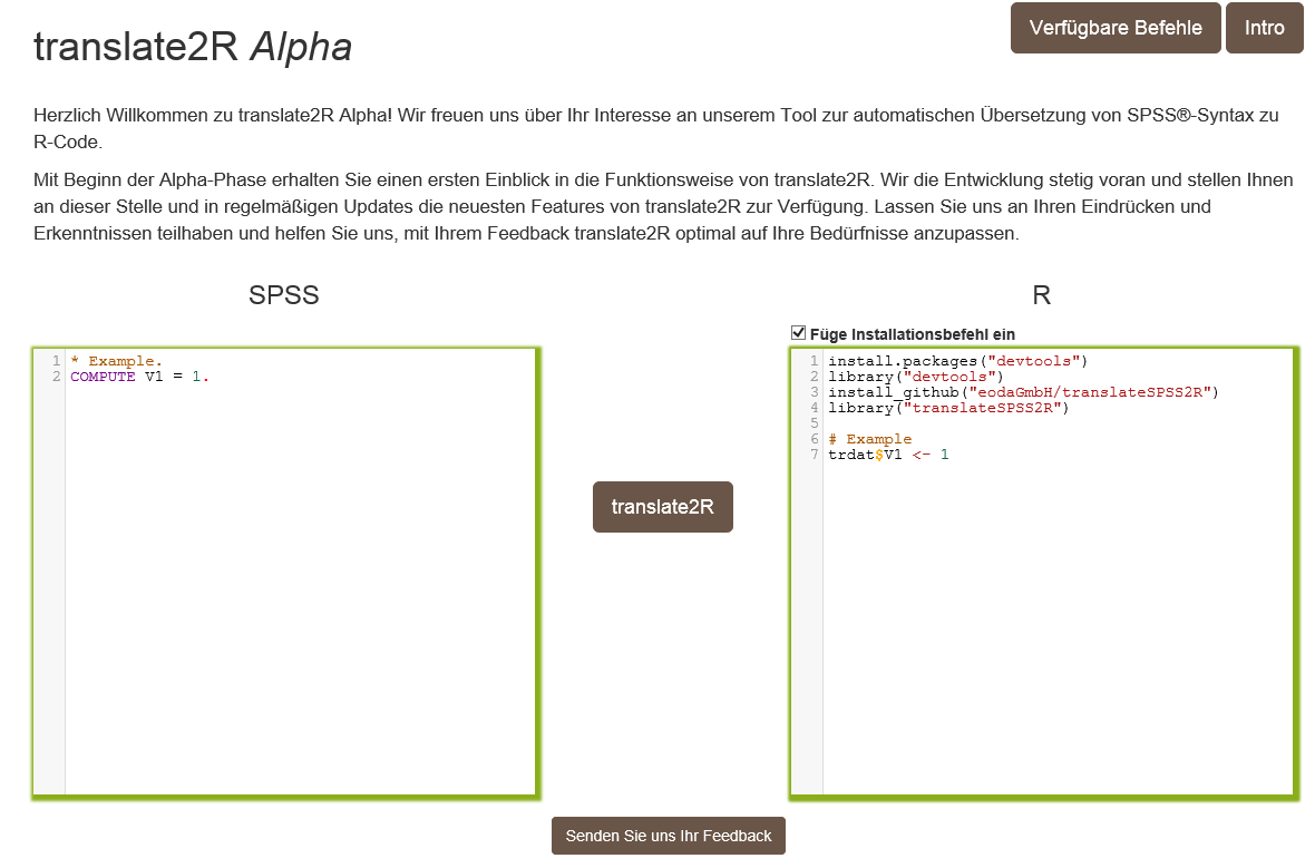 Herzlich Willkommen zu translate2R Alpha! Wir freuen uns über Ihr Interesse an unserem Tool zur automatischen Übersetzung von SPSS®-Syntax zu R-Code.