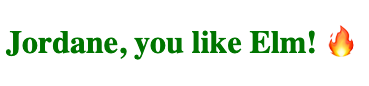 h1 [ style "color" "green" ] [ text (you.username ++ ", you like Elm! 🔥") ]