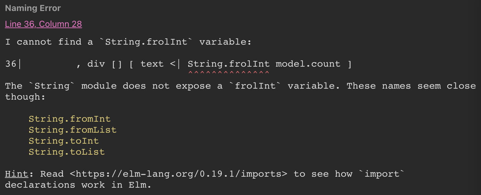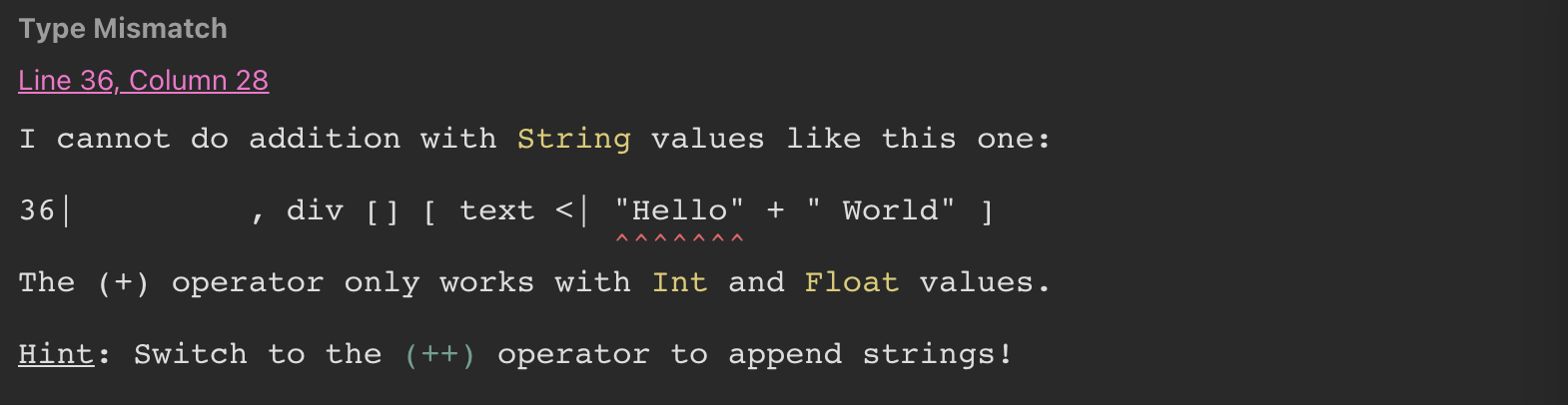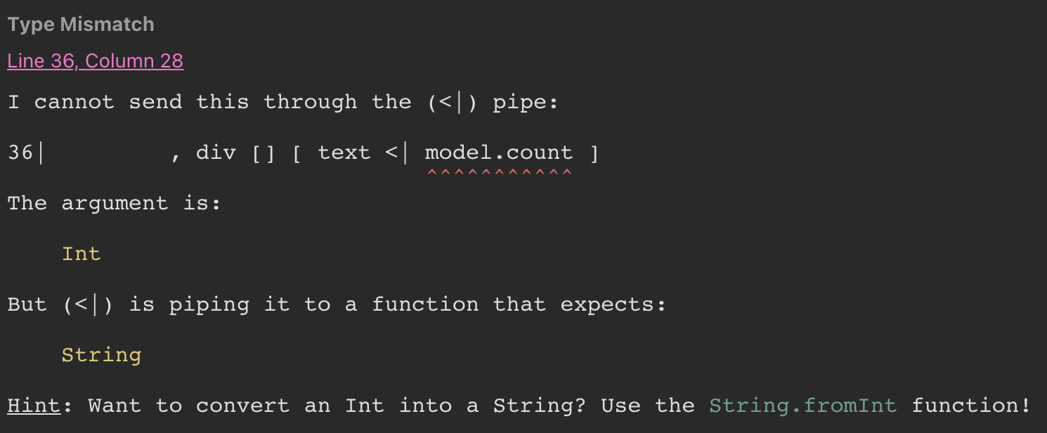 h1 [ style "color" "red" ] [ text (you.username ++ ", you don't like Elm?") ]