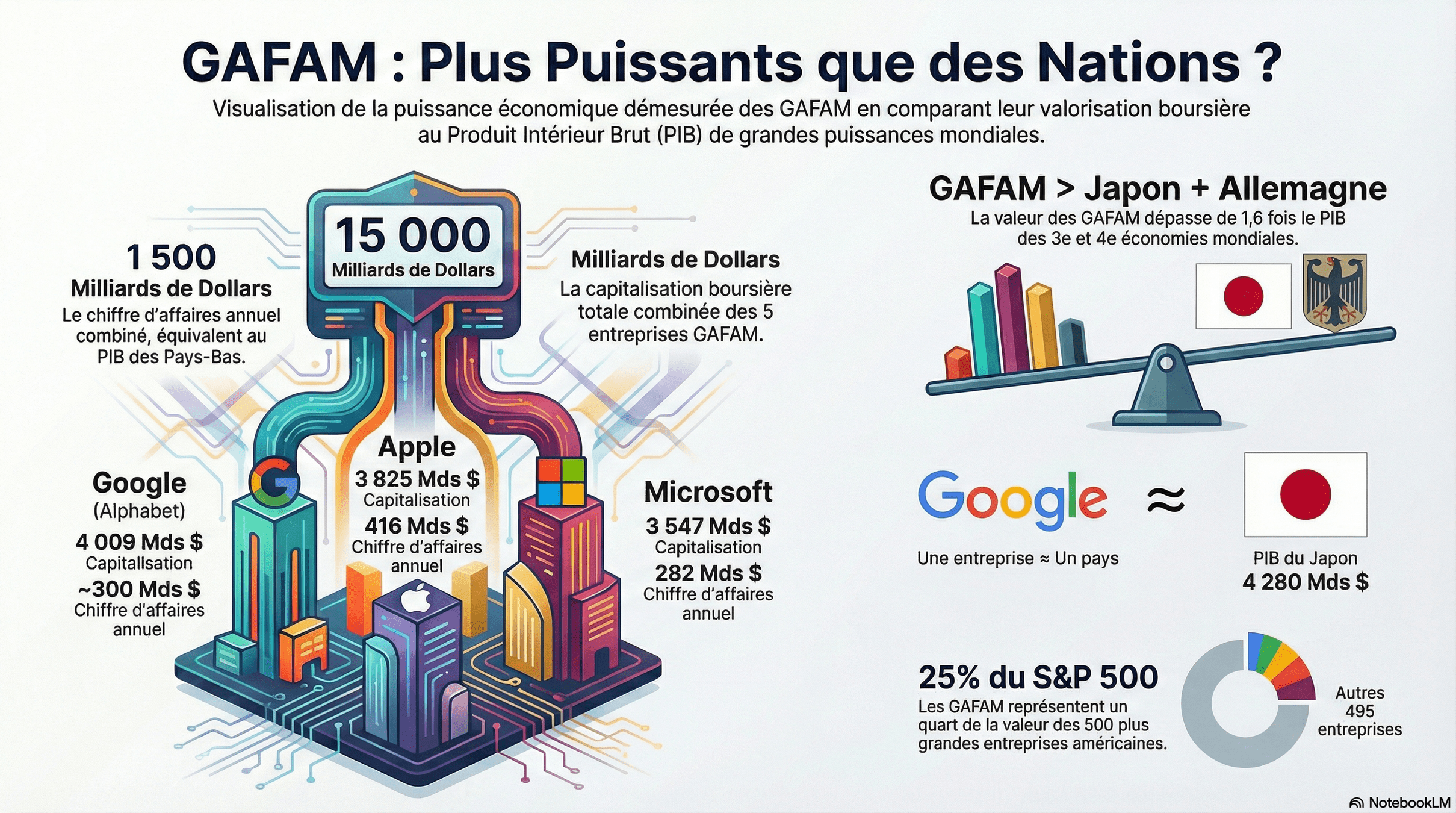 Les 5 géants du Web : Google, Apple, Facebook, Amazon et Microsoft qui sont les grandes firmes américaines pionnières dans le marché du numérique et qui dominent ce marché.