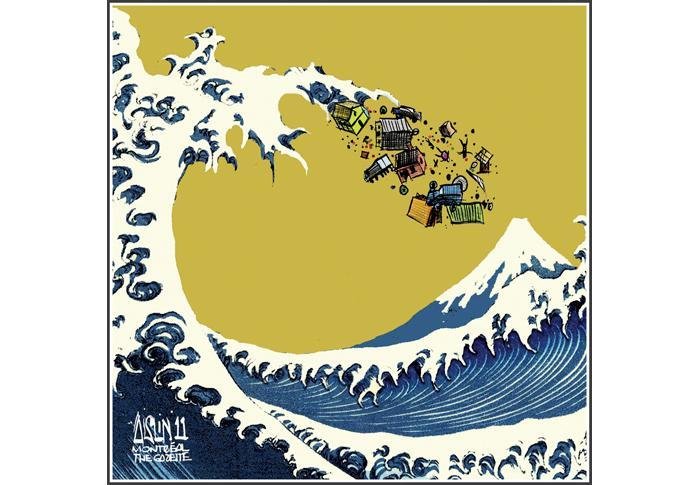 La Grande vague de Kanagawa, célèbre estampe de Hokusai, revisitée dans le cadre d'un projet de dessinateurs de presse paru sur le site de Courrier international le 18/03/2011, 7 jours après le tsunami qui a frappé le Japon et déclenché le désastre de Fukushima.