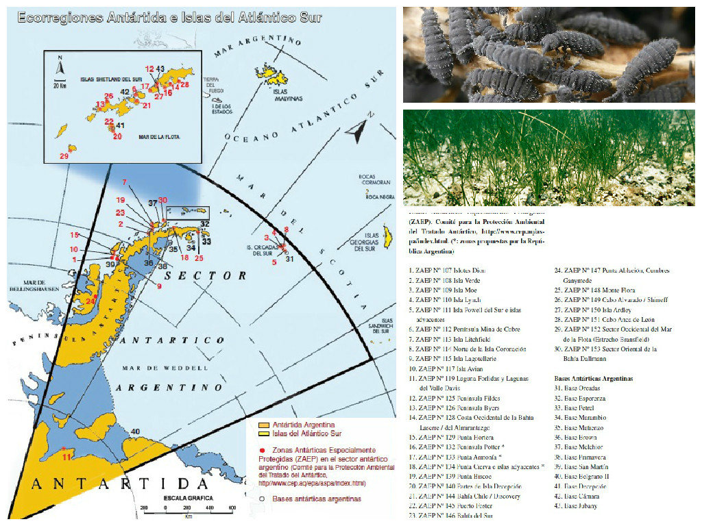 1. ZAEP Nº 107 Islotes Dion 2. ZAEP Nº 108 Isla Verde 3. ZAEP Nº 109 Isla Moe 4. ZAEP Nº 110 Isla Lynch 5. ZAEP Nº 111 Isla Powell del Sur e islas adyacentes 6. ZAEP Nº 112 Península Mina de Cobre 7. ZAEP Nº 113 Isla Litchfield 8. ZAEP Nº 114 Norte de la Isla Coronación 9. ZAEP Nº 115 Isla Lagotellerie 10. ZAEP Nº 117 Isla Avian 11. ZAEP Nº 119 Laguna Forlidas y Lagunas del Valle Davis 12. ZAEP Nº 125 Península Fildes 13. ZAEP Nº 126 Península Byers 14. ZAEP Nº 128 Costa Occidental de la Bahía Laserre / del Almirantazgo 15. ZAEP Nº 129 Punta Hortera 16. ZAEP Nº 132 Península Potter * 17. ZAEP Nº 133 Punta Armonía * 18. ZAEP Nº 134 Punta Cierva e islas adyacentes * 19. ZAEP Nº 139 Punta Biscoe 20. ZAEP Nº 140 Partes de Isla Decepción 21. ZAEP Nº 144 Bahía Chile / Discovery 22. ZAEP Nº 145 Puerto Foster 23. ZAEP Nº 146 Bahía del Sur24. ZAEP Nº 147 Punta Ablación, Cumbres Ganymede 25. ZAEP Nº 148 Monte Flora 26. ZAEP Nº 149 Cabo Alvarado / Shirreff 27. ZAEP Nº 150 Isla Ardley 28. ZAEP Nº 151 Cabo Anca de León 29. ZAEP Nº 152 Sector Occidental del Mar de la Flota (Estrecho Bransfield) 30. ZAEP Nº 153 Sector Oriental de la Bahía Dallmann