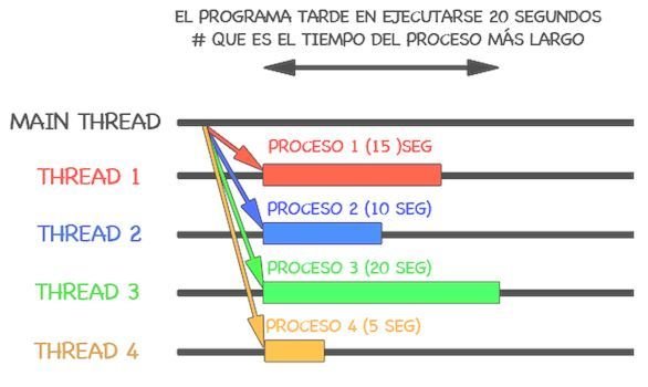 - si el hilo principal crea otros hilos, éstos se ejecutan de forma concurrente