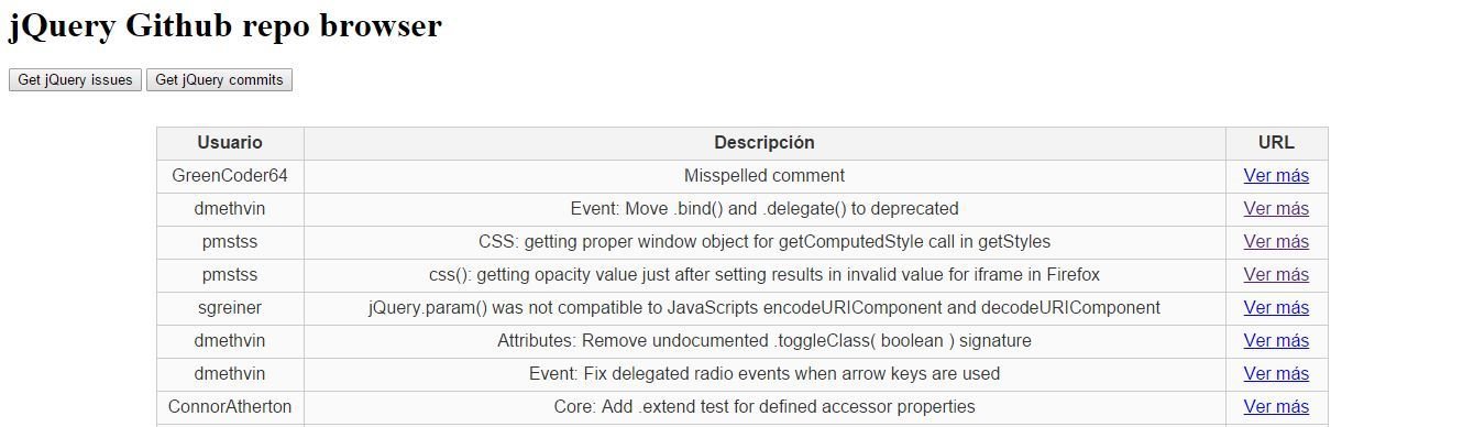- Listado de los últimos commits realizados sobre el repositorio de jQuery