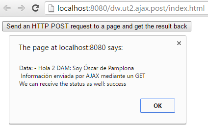 });Se envía una petición de tipo POST a la URL some.php pasándole el objeto JSON asociado a data. Cuando se produzca la respuesta del servidor, se mostrará en un alert la respuesta