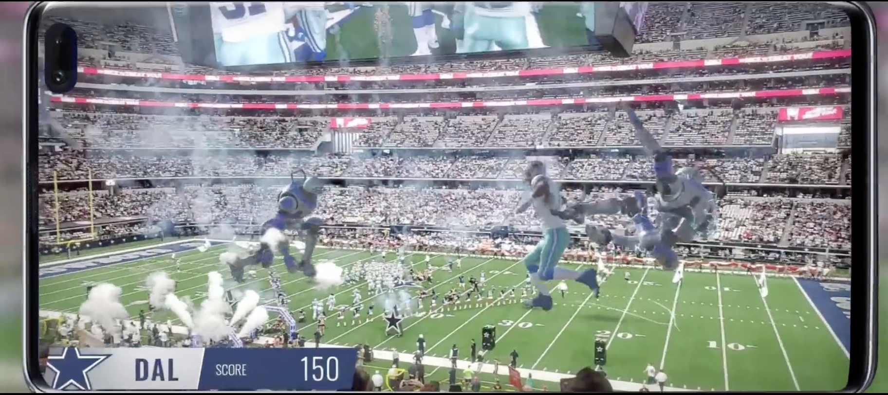 El AT&T Stadium presentó hologramas de 80 pies de los Dallas Cowboys que se podían ver tanto dentro como fuera del estadio a través de teléfonos Samsung con capacidad 5G.