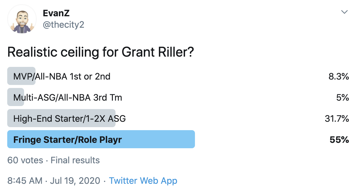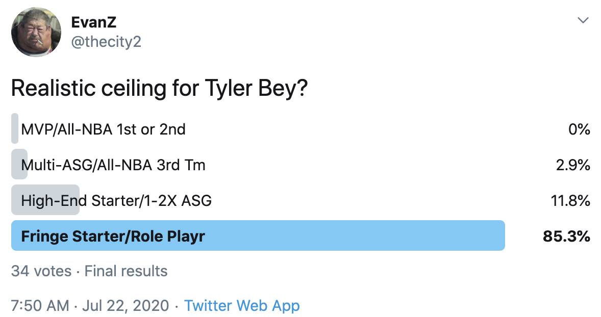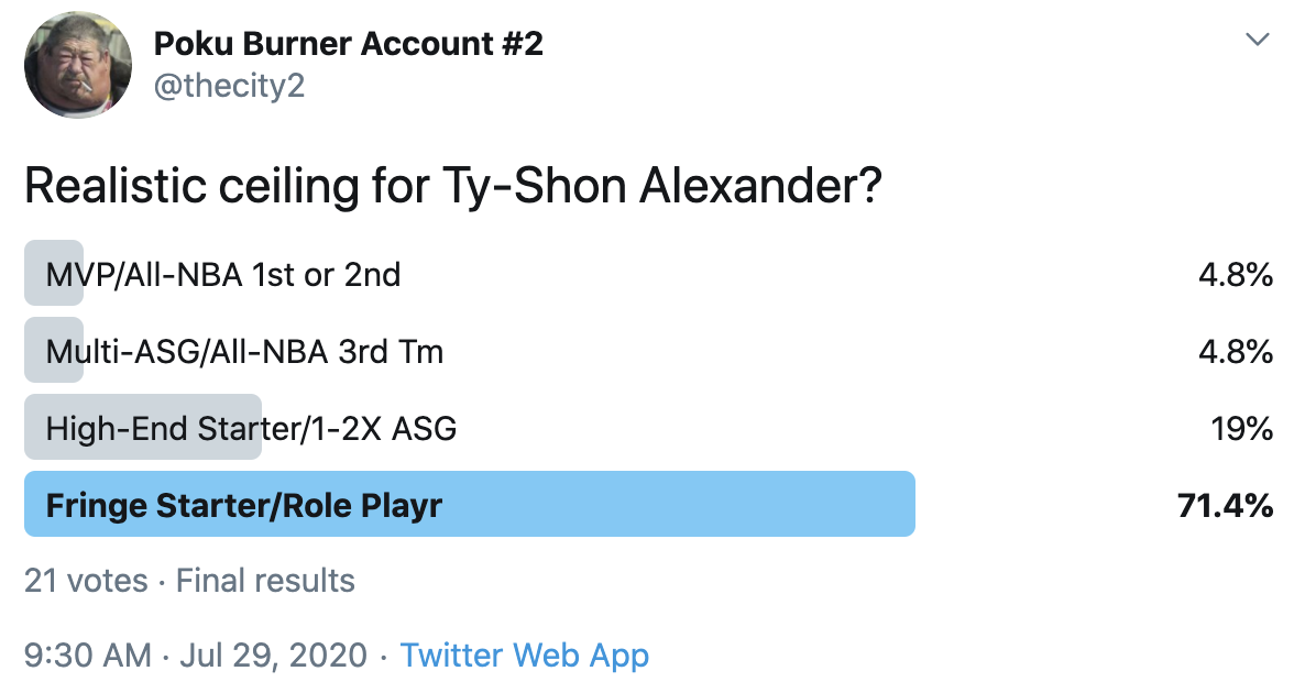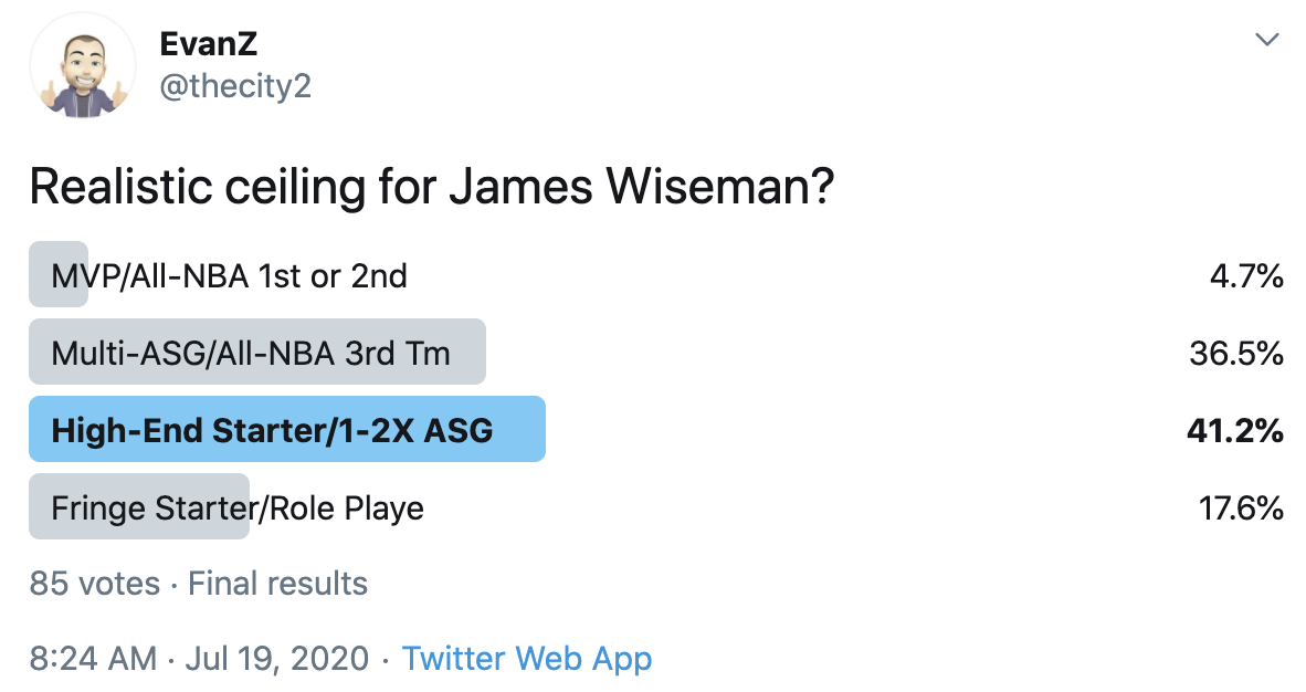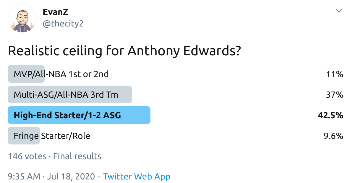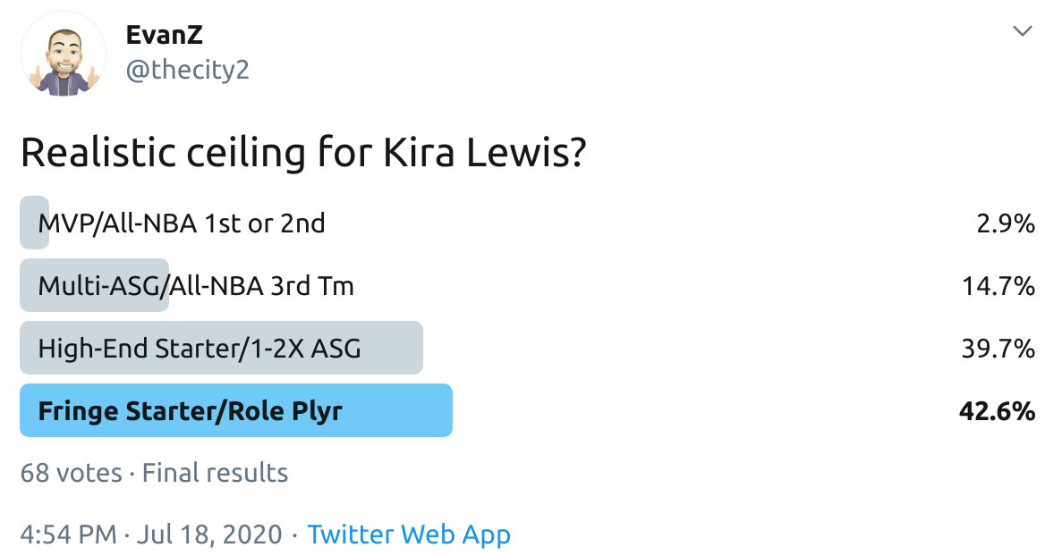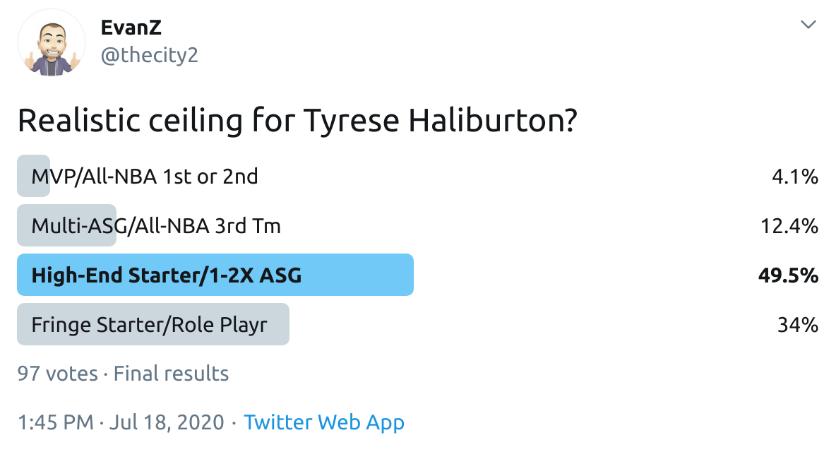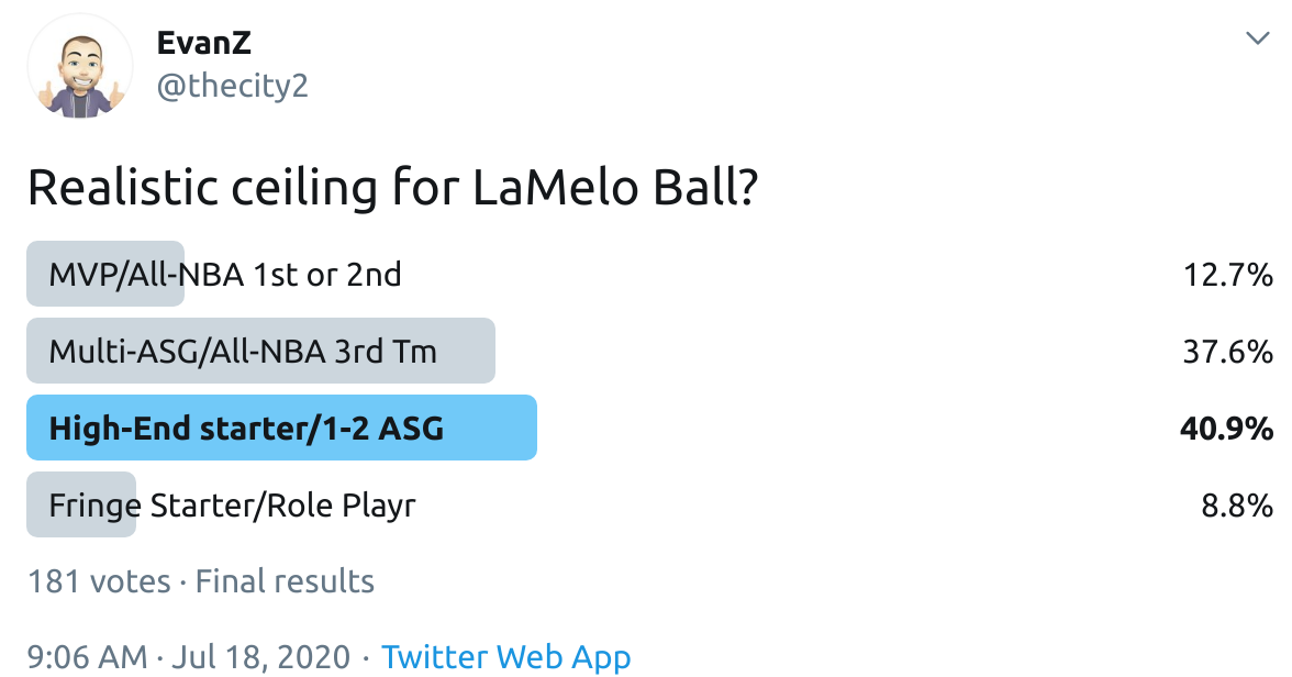 I ran a bunch of polls on Twitter to gauge sentiment on prospects (the poll for LaMelo Ball is shown in the inset). The chart summarizes the results and orders players by an MVP-like voting system which gives 4 points for the top tier, 3 points for the next tier, and so on. Because Twitter limits polls to 4 options, I couldn't fit all 6 of my tier definitions, but this should be a pretty good approximation of #DraftTwitter sentiment (biased of course by my followers). Total votes in parentheses.