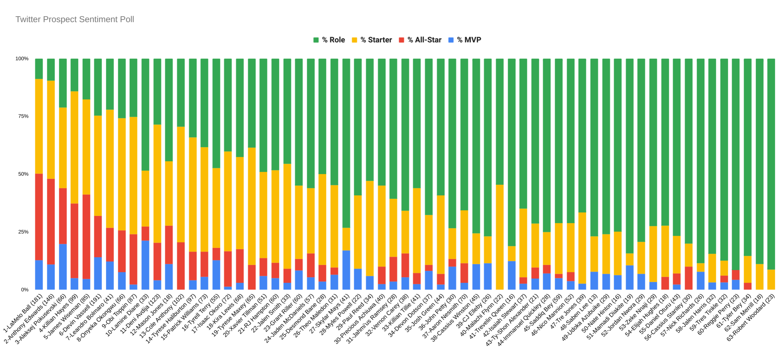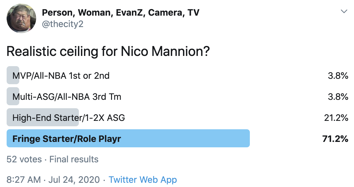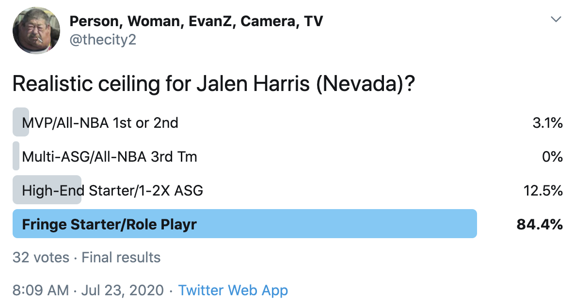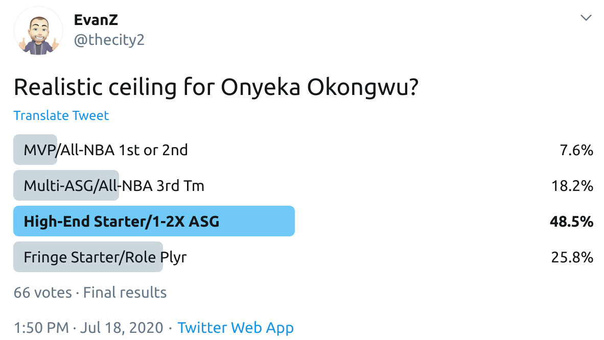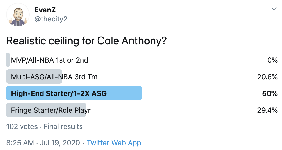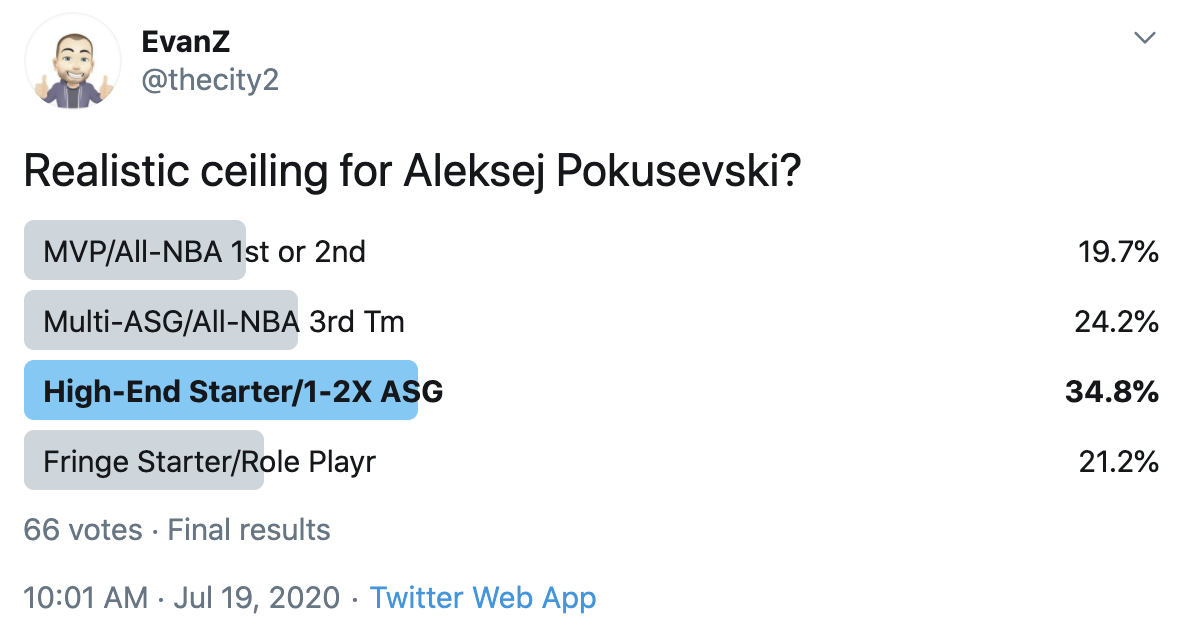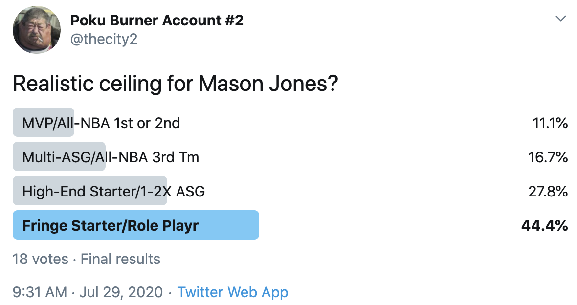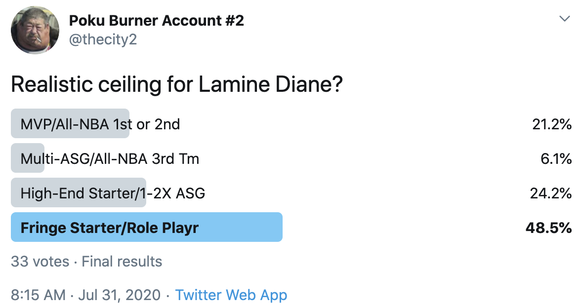 I ran a bunch of polls on Twitter to gauge sentiment on prospects (the poll for LaMelo Ball is shown in the inset). The chart summarizes the results and orders players by an MVP-like voting system which gives 4 points for the top tier, 3 points for the next tier, and so on. Because Twitter limits polls to 4 options, I couldn't fit all 6 of my tier definitions, but this should be a pretty good approximation of #DraftTwitter sentiment (biased of course by my followers). Total votes in parentheses.