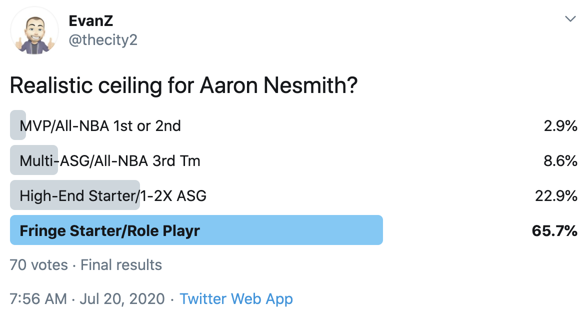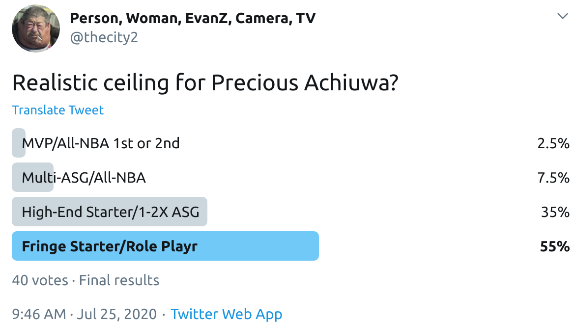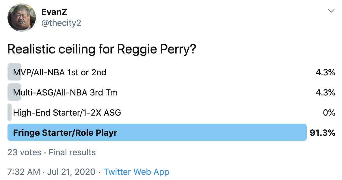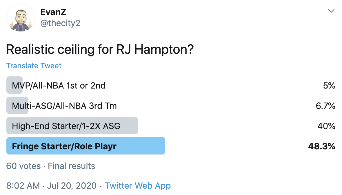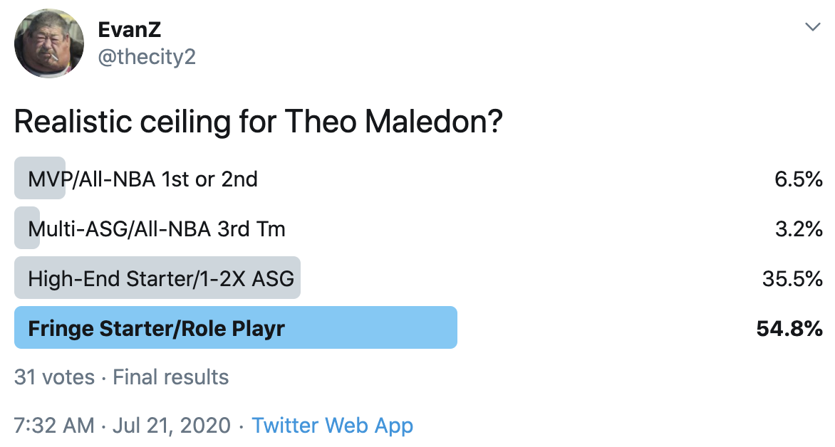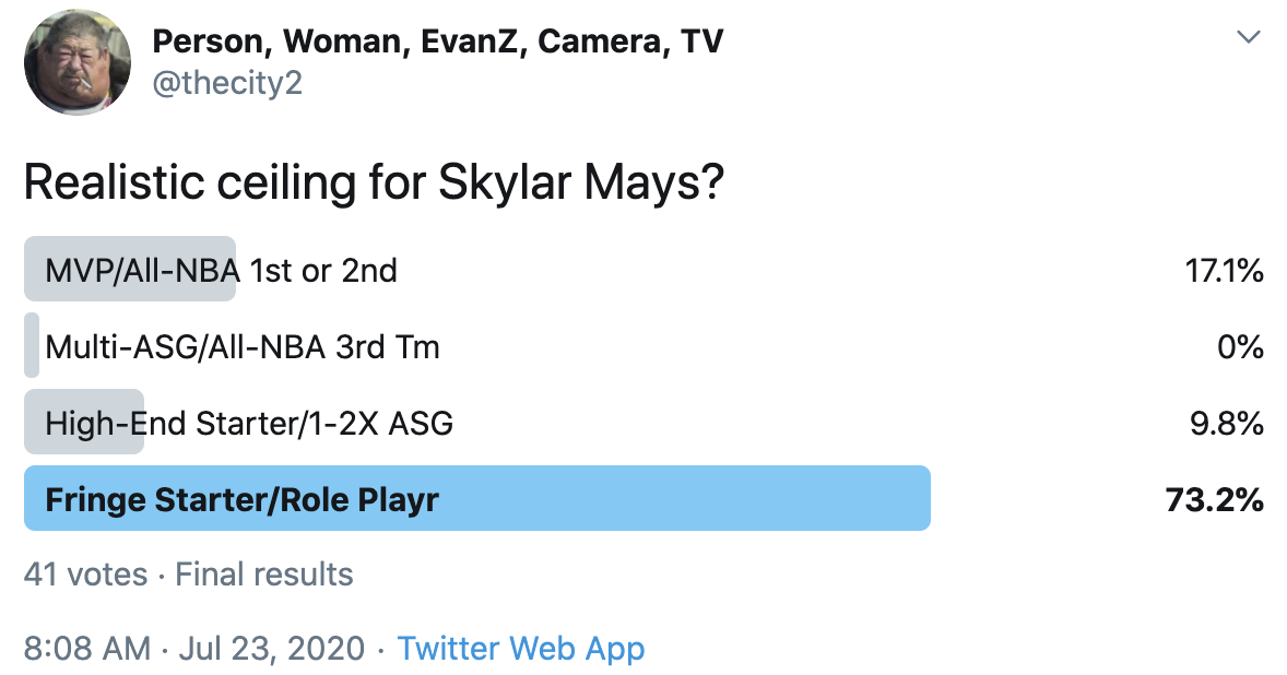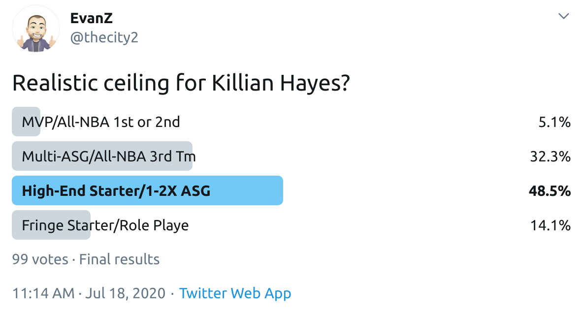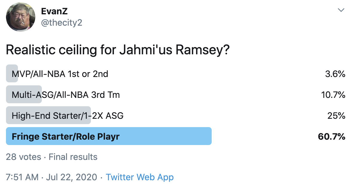 I ran a bunch of polls on Twitter to gauge sentiment on prospects (the poll for LaMelo Ball is shown in the inset). The chart summarizes the results and orders players by an MVP-like voting system which gives 4 points for the top tier, 3 points for the next tier, and so on. Because Twitter limits polls to 4 options, I couldn't fit all 6 of my tier definitions, but this should be a pretty good approximation of #DraftTwitter sentiment (biased of course by my followers). Total votes in parentheses.
