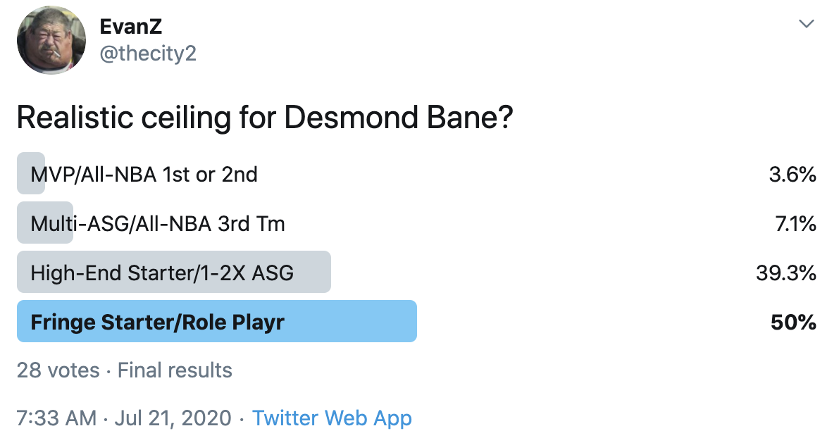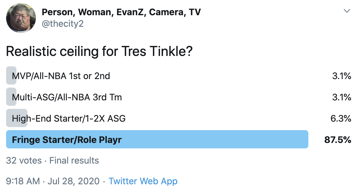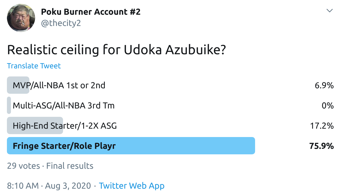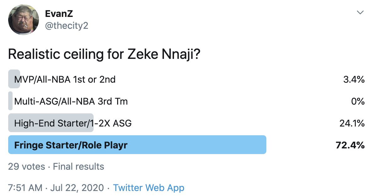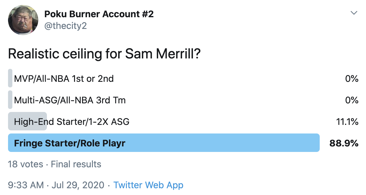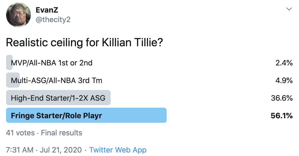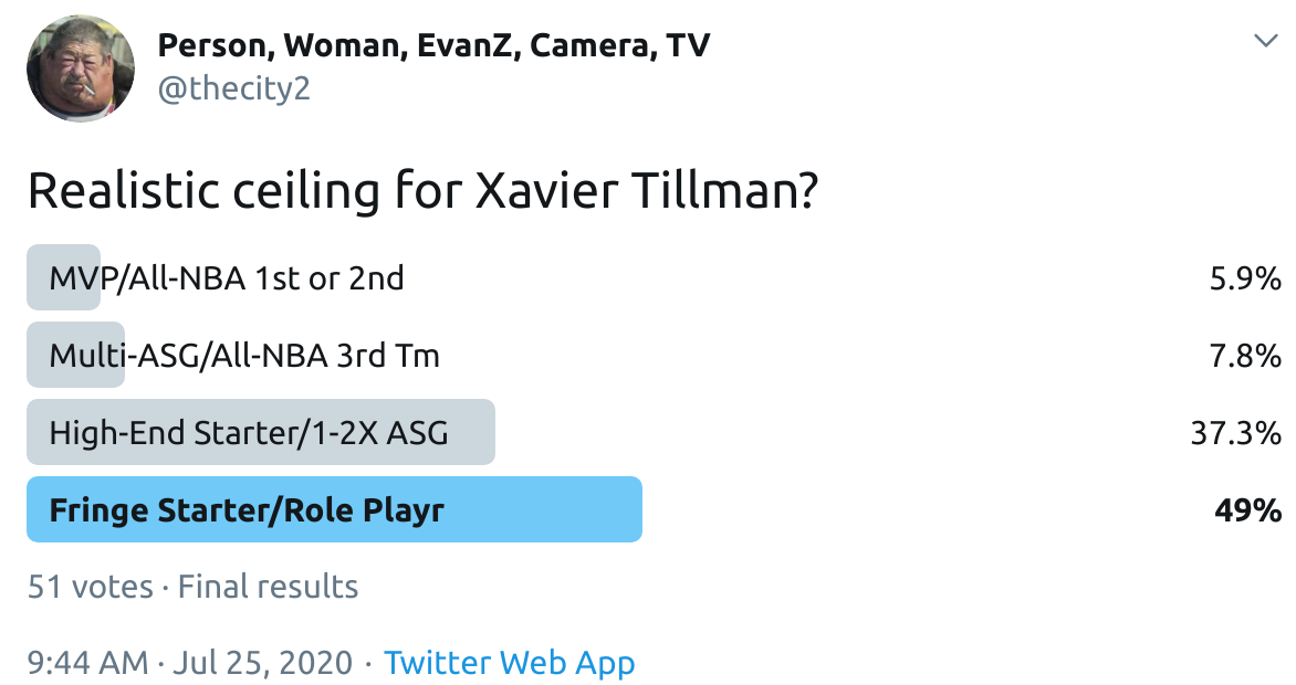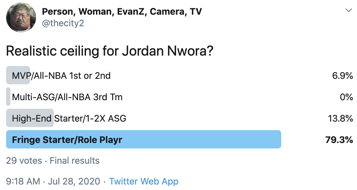 I ran a bunch of polls on Twitter to gauge sentiment on prospects (the poll for LaMelo Ball is shown in the inset). The chart summarizes the results and orders players by an MVP-like voting system which gives 4 points for the top tier, 3 points for the next tier, and so on. Because Twitter limits polls to 4 options, I couldn't fit all 6 of my tier definitions, but this should be a pretty good approximation of #DraftTwitter sentiment (biased of course by my followers). Total votes in parentheses.
